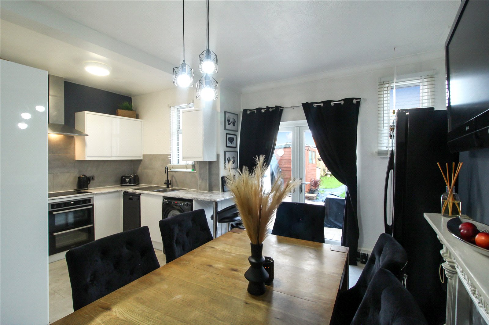 Bright and spacious kitchen / dining room with uPVC double glazed windows and French doors to rear with view and access into the garden. Range of eye and base level units including integrated stainless-steel sink with drainer and mixer tap, oven, induction hob with extractor fan and under counter space for utilities.