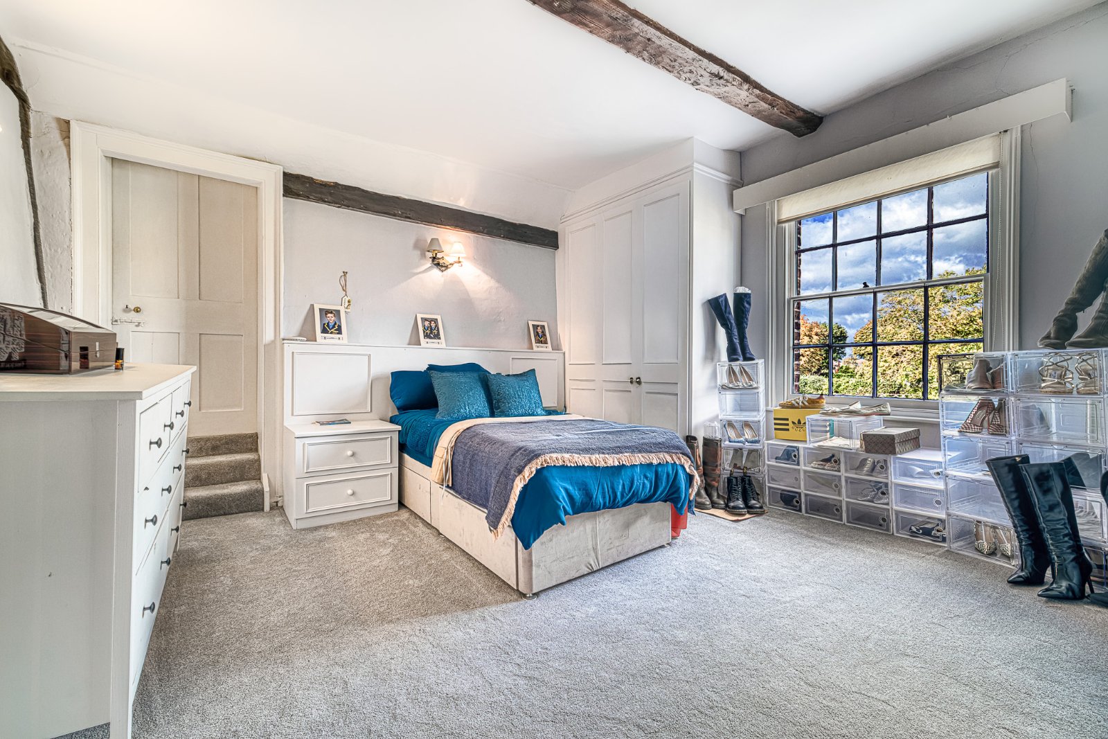 The bedroom offers a well-proportioned space, where the exposed timber beams contrast beautifully against the whitewashed walls. A sash window frames views to the side aspect. Radiator. Wall lighting.