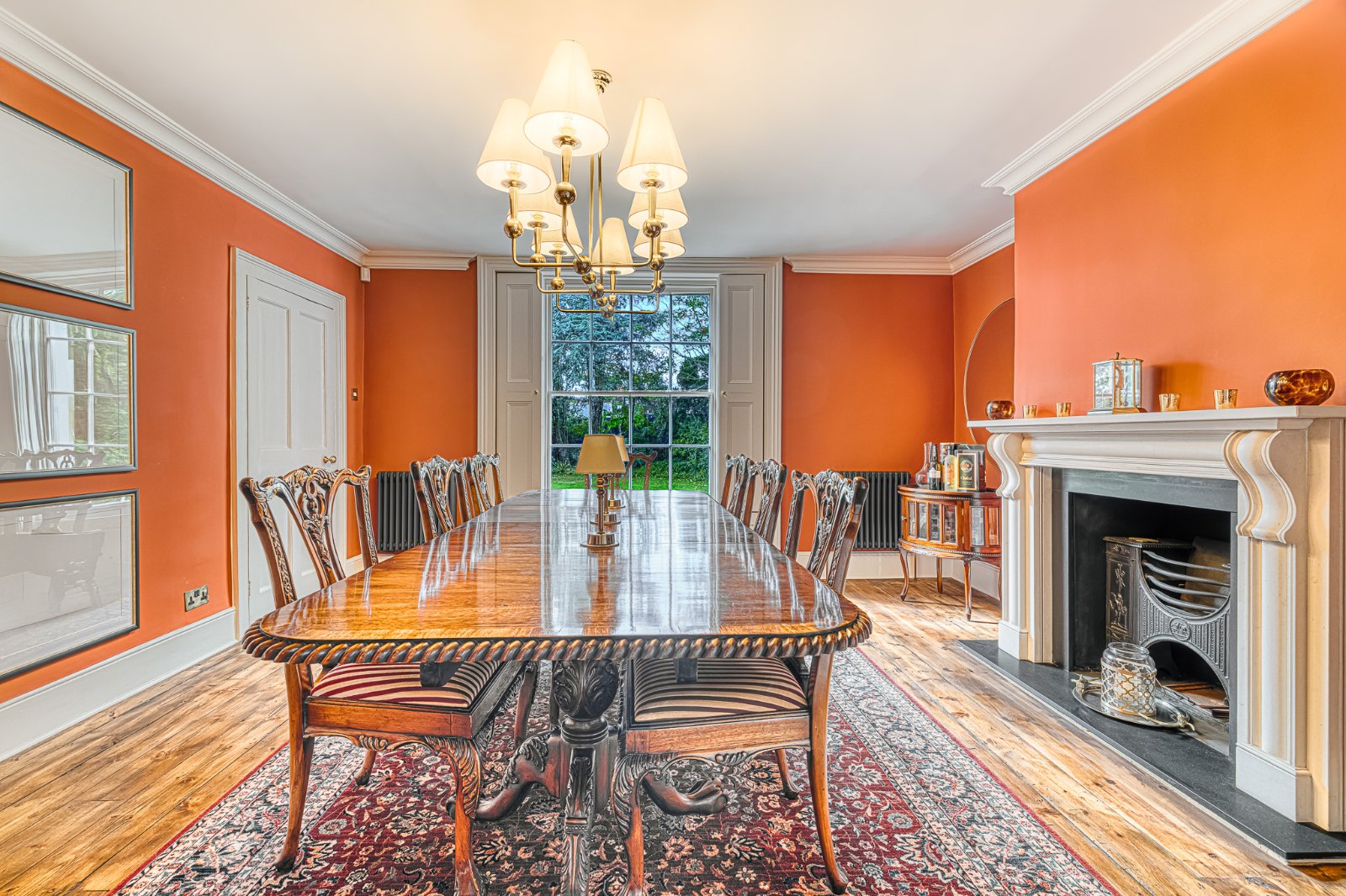 The Dining Room provides a grand yet welcoming setting, ideal for both formal occasions and family gatherings. A striking cast iron fireplace with a carved stone mantel forms a focal point.
