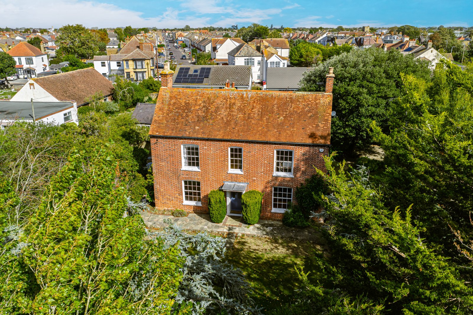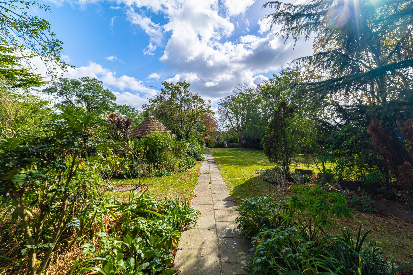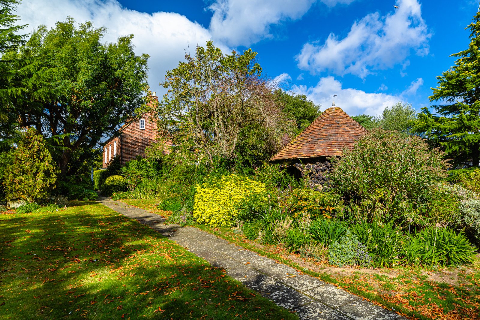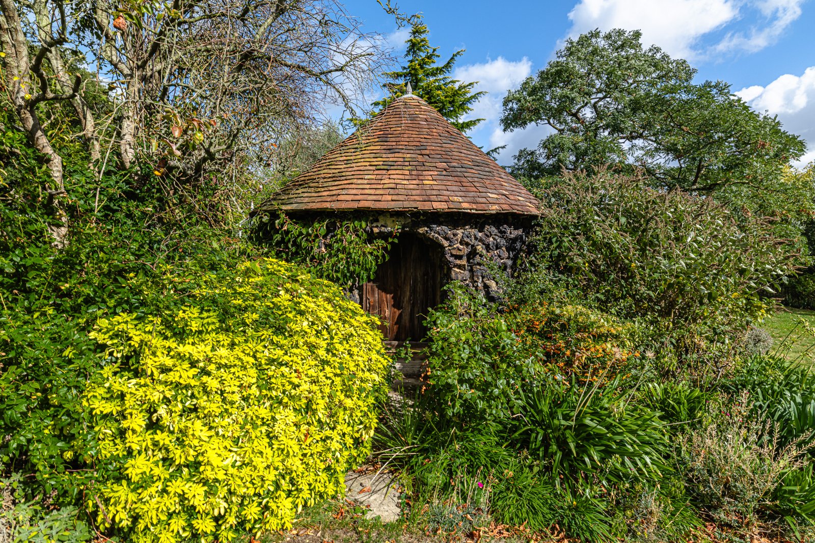 The heritage of the estate is not confined to the house alone. Set within grounds exceeding an acre, the property enjoys sweeping lawns, established planting, and a wraparound terrace. Among the highlights is a late-18th/early-19th-century circular structure in burr brick with a conical tiled roof, historically believed to have been a beehive house — a rare survival that adds both charm and provenance. A traditional greenhouse and additional garden structures further complement the setting, which balances seclusion with accessibility.