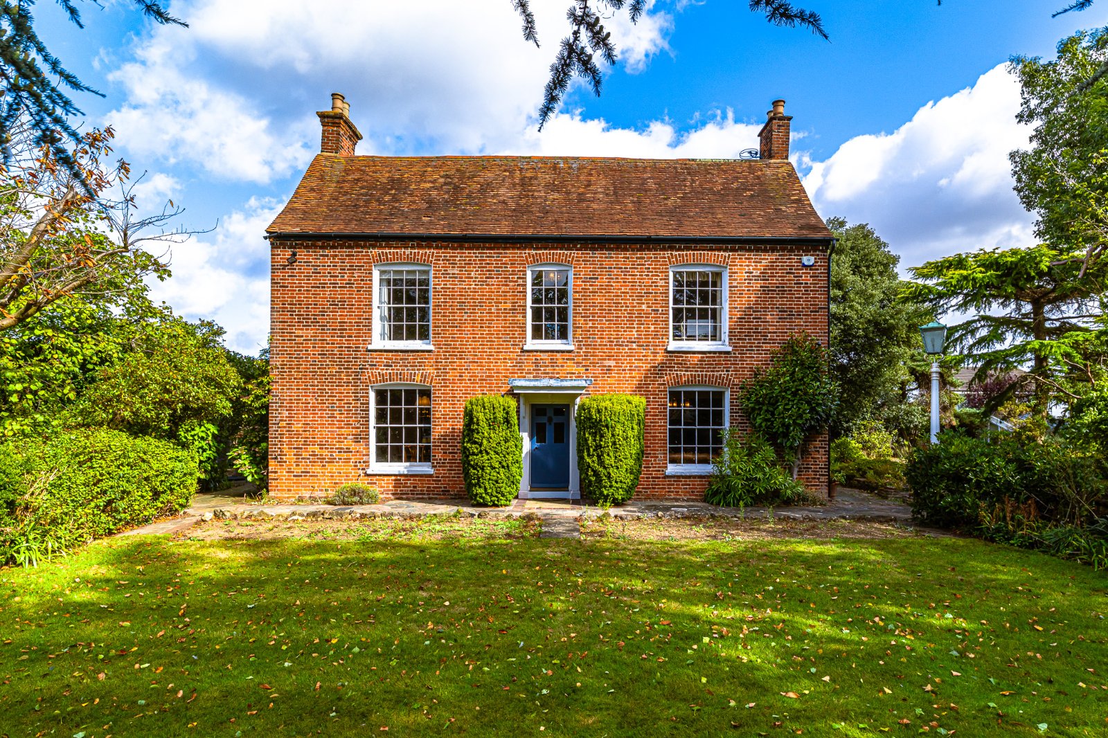The farmhouse presents a picturesque Georgian frontage of red brick and tall sash windows. A central doorway with original flat hood provides a charming and formal entry point, flanked by manicured shrubs and opening directly onto the welcoming entrance hall.