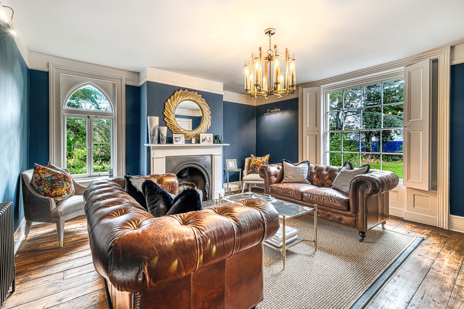The Formal Living Room is an elegant and atmospheric space, centred around a handsome fireplace with cast iron surround and painted mantelpiece. A striking Gothic-arched window on the side elevation adds character and floods the room with natural light, complementing the large original south facing sash window, complete with working panelled shutters.