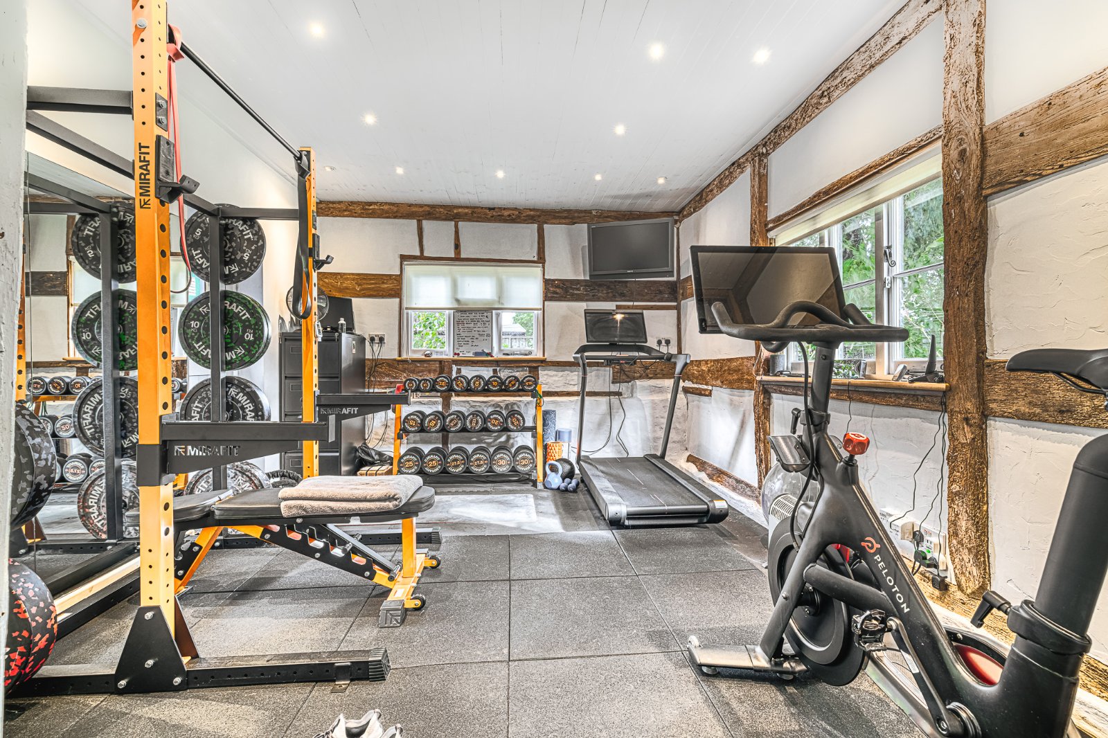The Gym combines functionality with historic charm. Exposed timber beams line the walls and ceiling, providing a rustic backdrop, while spotlighting ensures focused illumination. The room benefits from dual-aspect windows to the side and rear aspect together with cottage-style door leads directly onto the garden. Currently arranged as a home fitness suite the room is adaptable for a variety of uses.