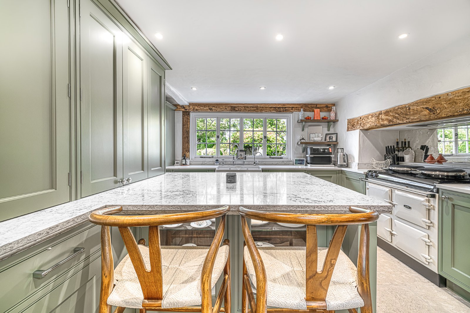At the heart of the room is a classic Aga, set beneath an exposed timber beam, complemented by a suite of integrated appliances including a dishwasher, fridge, freezer, and 'Siemens' wine fridge. A double recessed Butler style sink with mixer tap and filtered water tap sits beneath a cottage style sash window to rear aspect with a matching multi pane sash window to front.