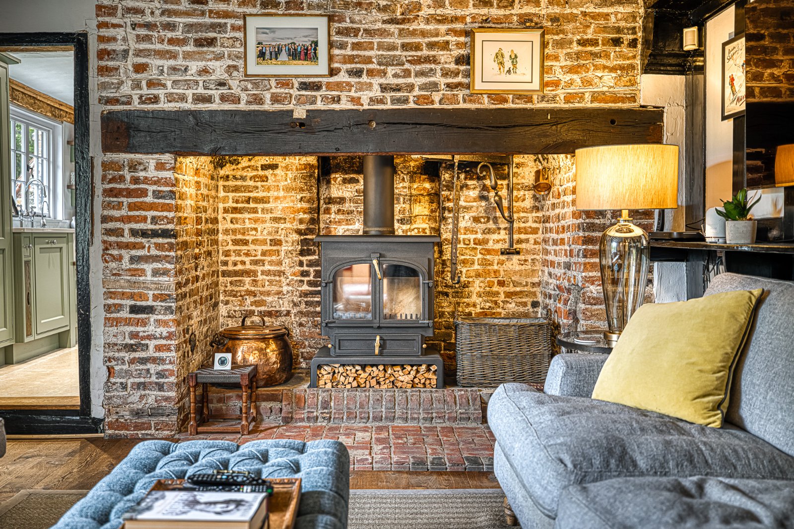 At its heart is a substantial original inglenook fireplace with exposed brickwork measuring 6'6 x 3'4, fitted with an attractive wood-burning stove. Traditional brick hearth detailing adds rustic charm.