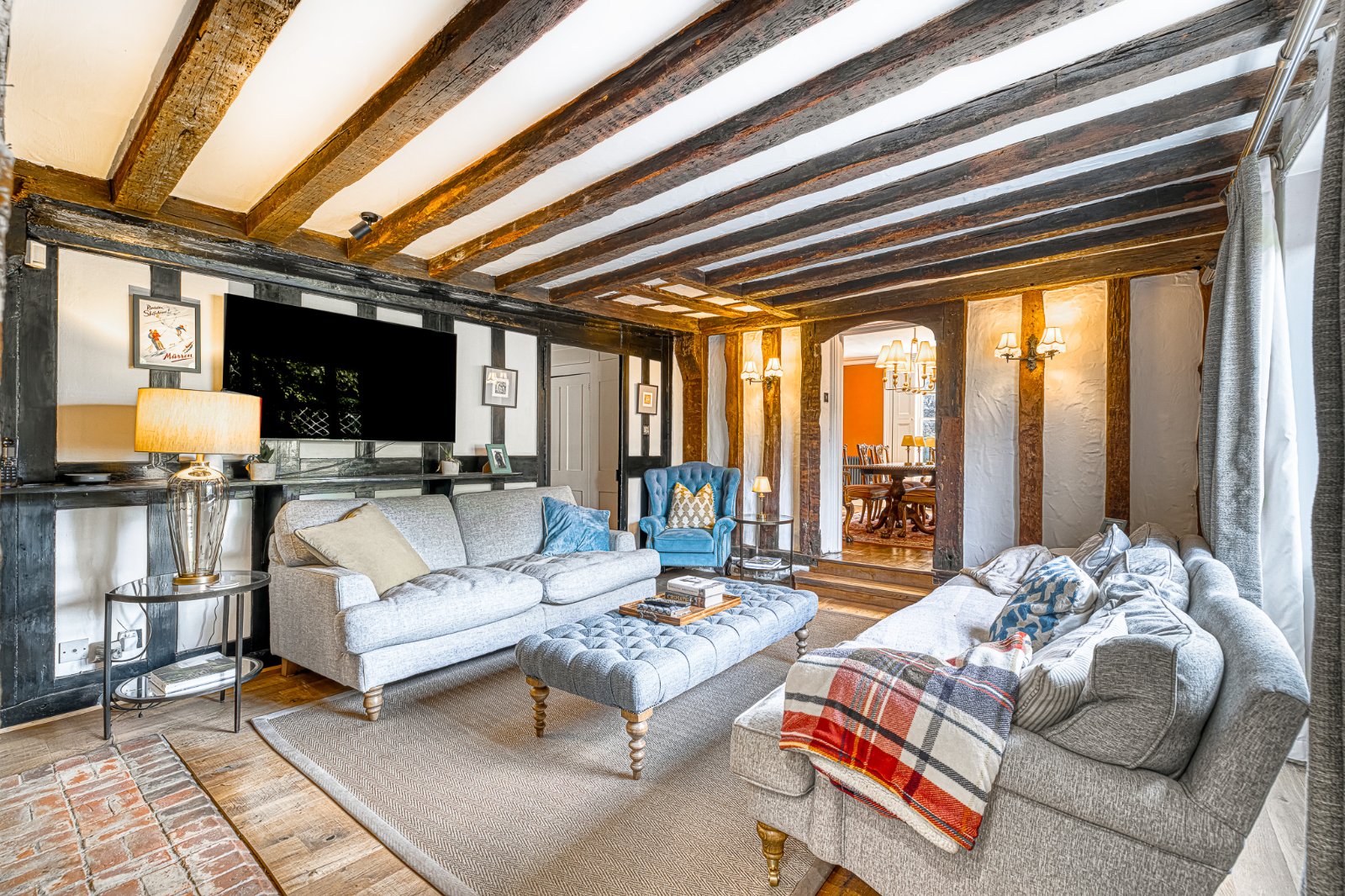 Accessed via the Kitchen, Inner Hallway and the Formal Dining Room a wonderfully atmospheric space showcasing the property’s medieval origins. The room is framed by exposed timber beams across the ceiling and walls and exposed natural wooden floorboards. highlighting the character of the home’s 16th-century structure.