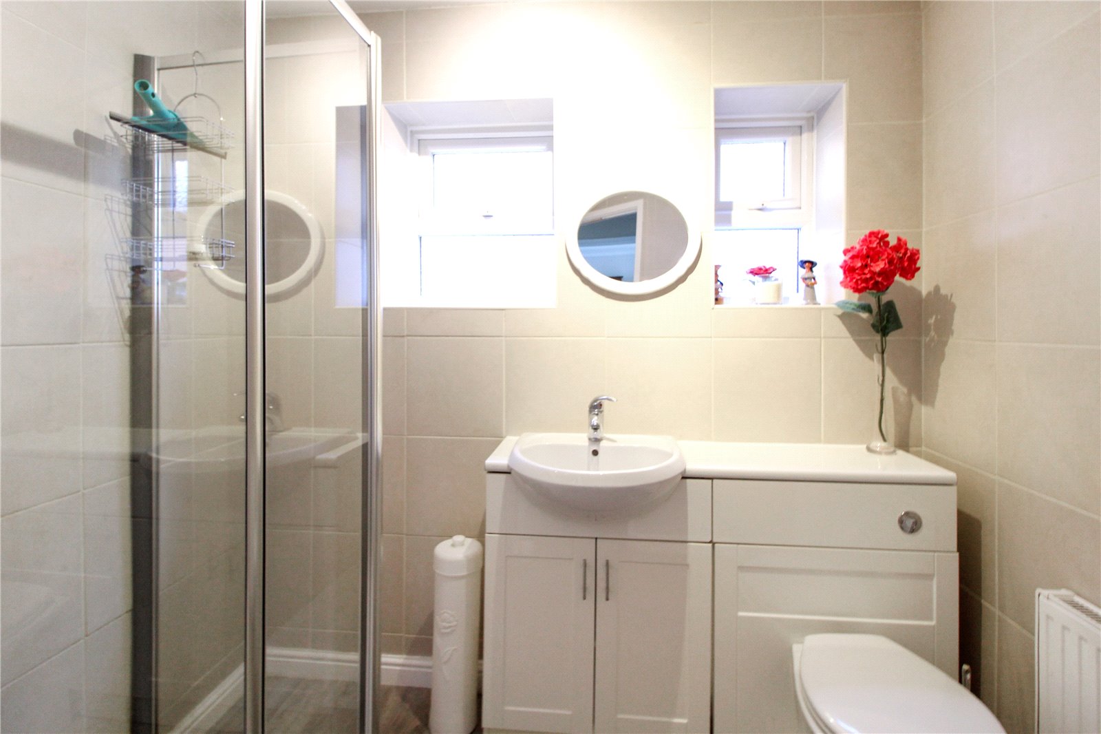 Shower, sink with vanity unit, WC, lino to floor, tiled walls, smooth ceiling, spotlights to ceiling, radiator, 2 x obscure double glazed windows to side aspect.