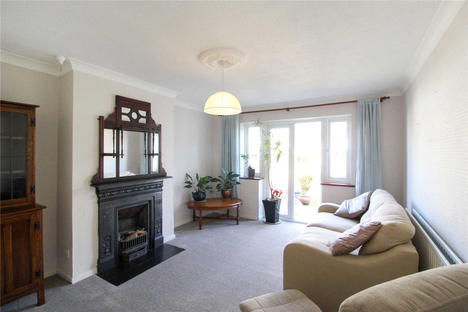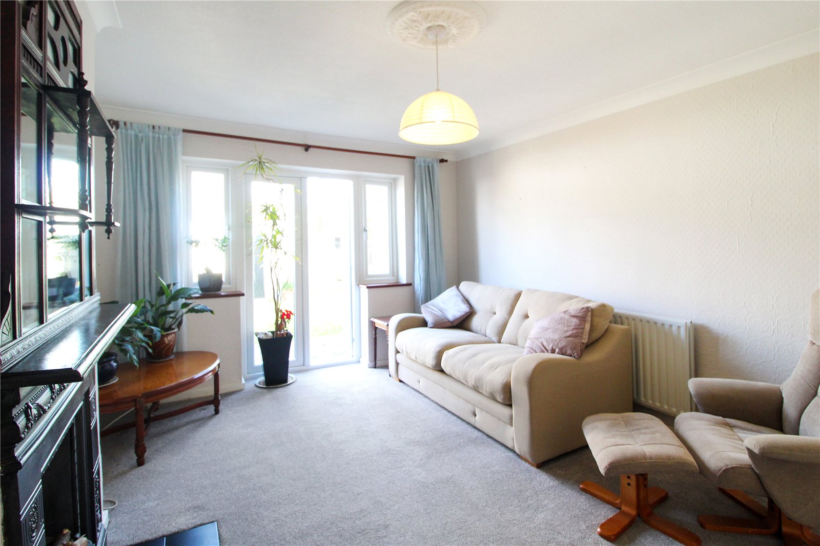 Bright and spacious room with double glazed, double doors to rear garden, and 2 x double glazed windows to rear aspect, fireplace, carpet to floor, radiator, ceiling light.