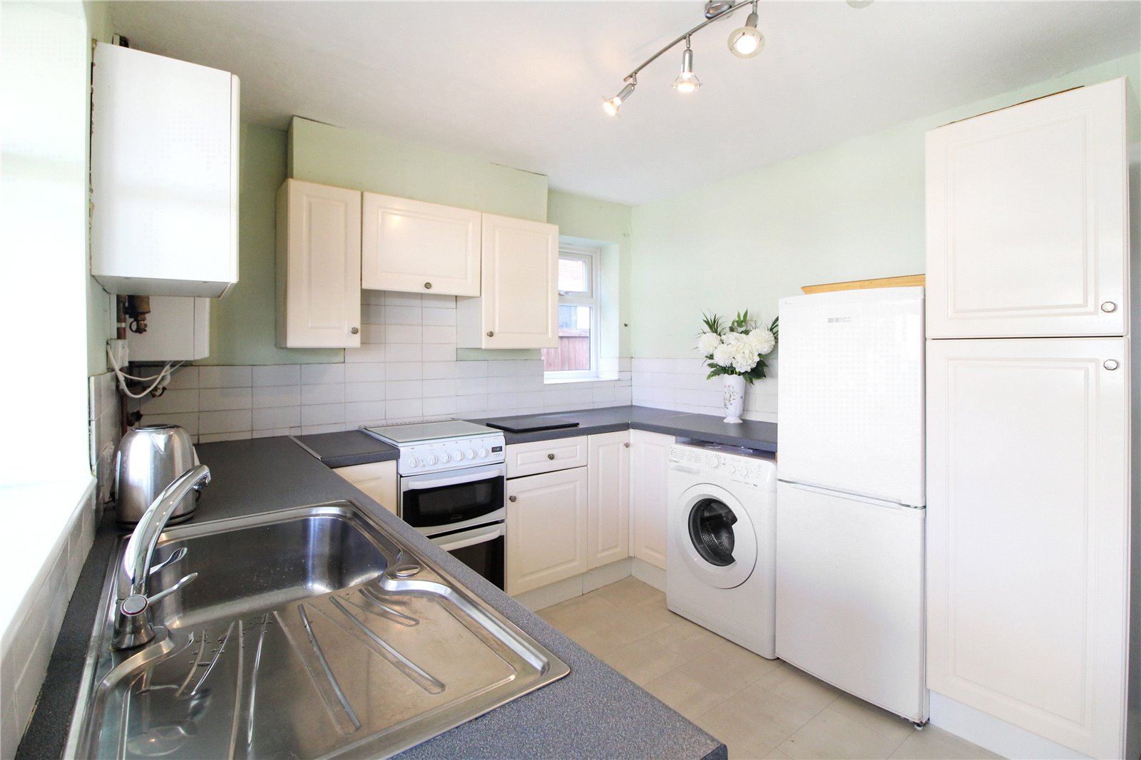 Fitted with eye and base level units, sink and drainer, lino to floor, smooth ceiling, ceiling light, double glazed window to rear aspect, door to conservatory.