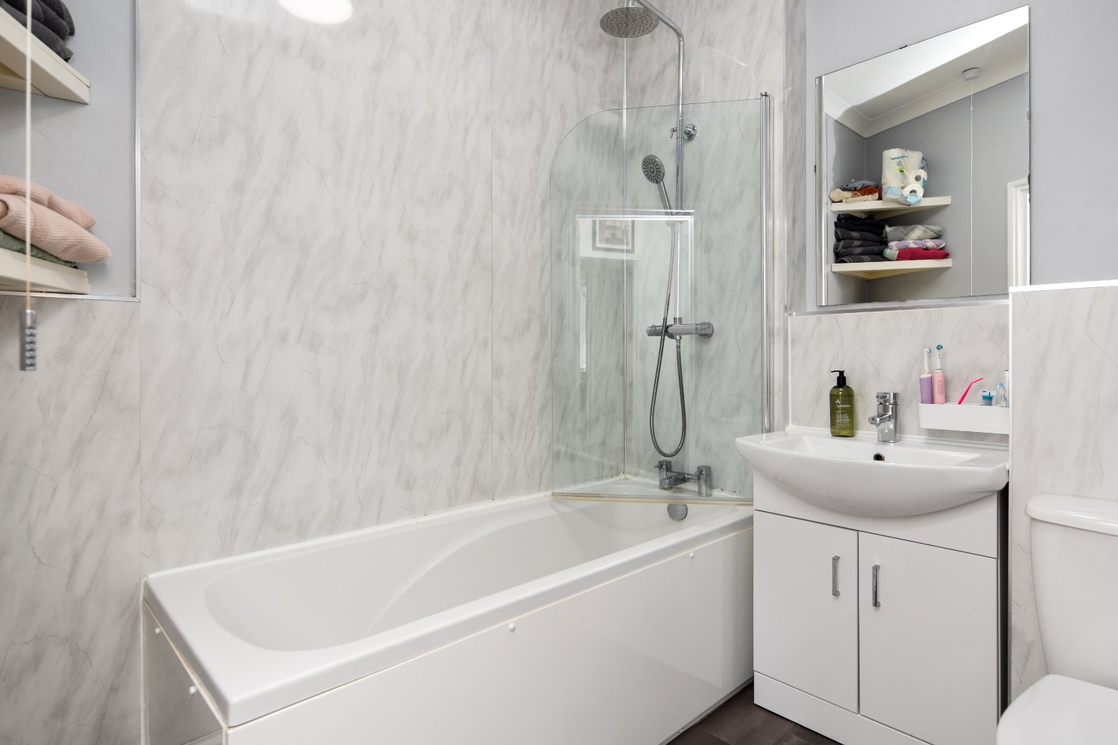 The Bathroom is fitted with a modern white three-piece suite comprising a panelled bath with integrated shower unit with rainfall shower, hand held attachment and glazed screen, a wash basin set within a vanity unit with mixer tap over and storage cupboards under and a low-level dual WC. Finished with marble-effect wall panelling, chrome fittings, and vinyl 'tiled effect' flooring for a sleek, low-maintenance look. Ladder style heated towel rail. A wall-mounted mirror and built-in shelving provide practical storage. Coving to smooth plastered ceiling.