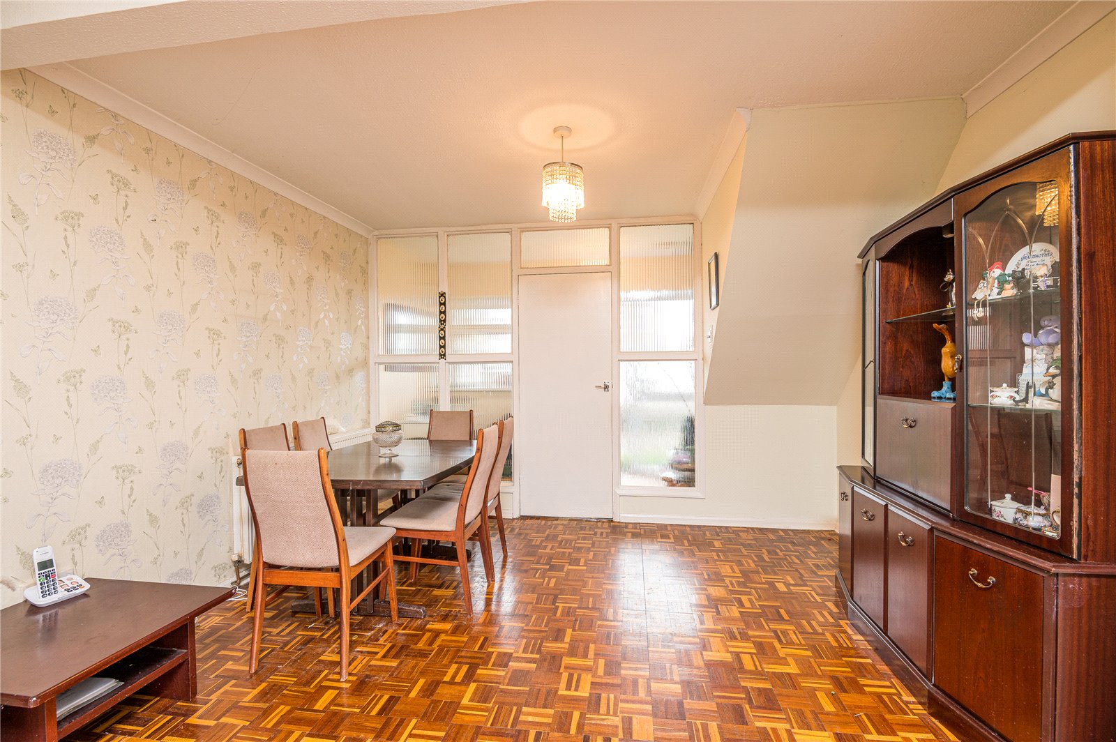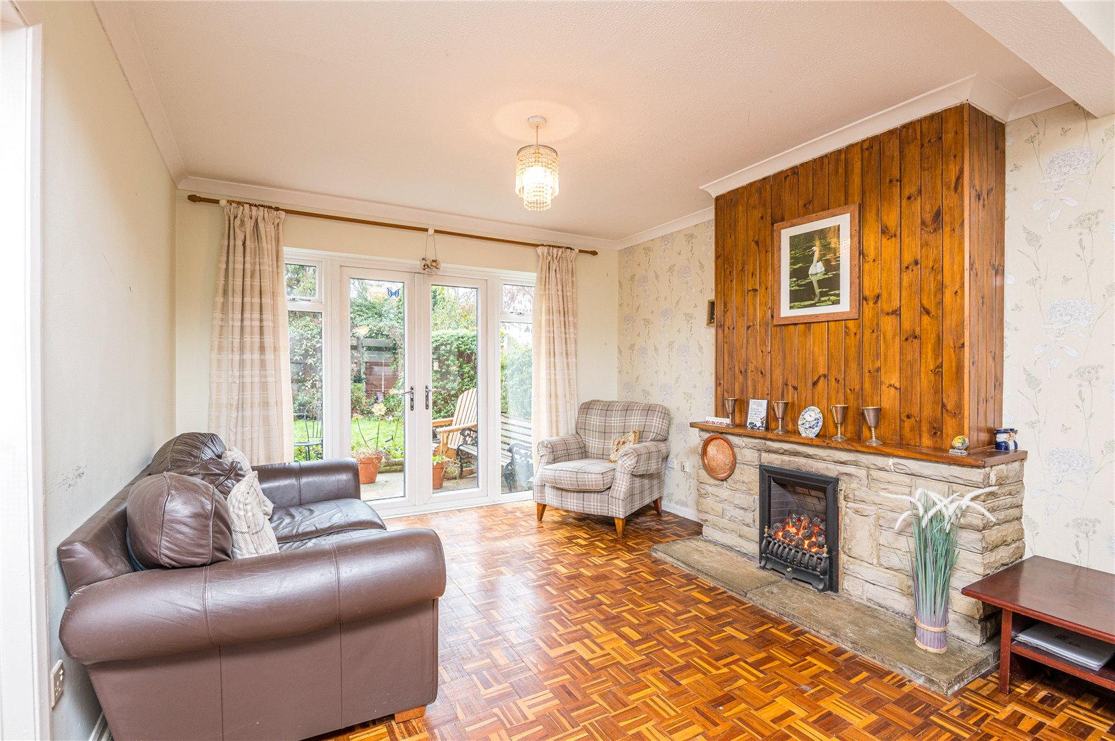 Upvc double glazed french doors to the rear aspect with windows adjacent. Coved cornicing with textured ceiling. Feature fireplace with inset gas coal effect fire. Telephone point. Double banked radiator. Parquet wood flooring. Dimmer switch. Wall mounted central heating thermostat. Door gives access to the kitchen.