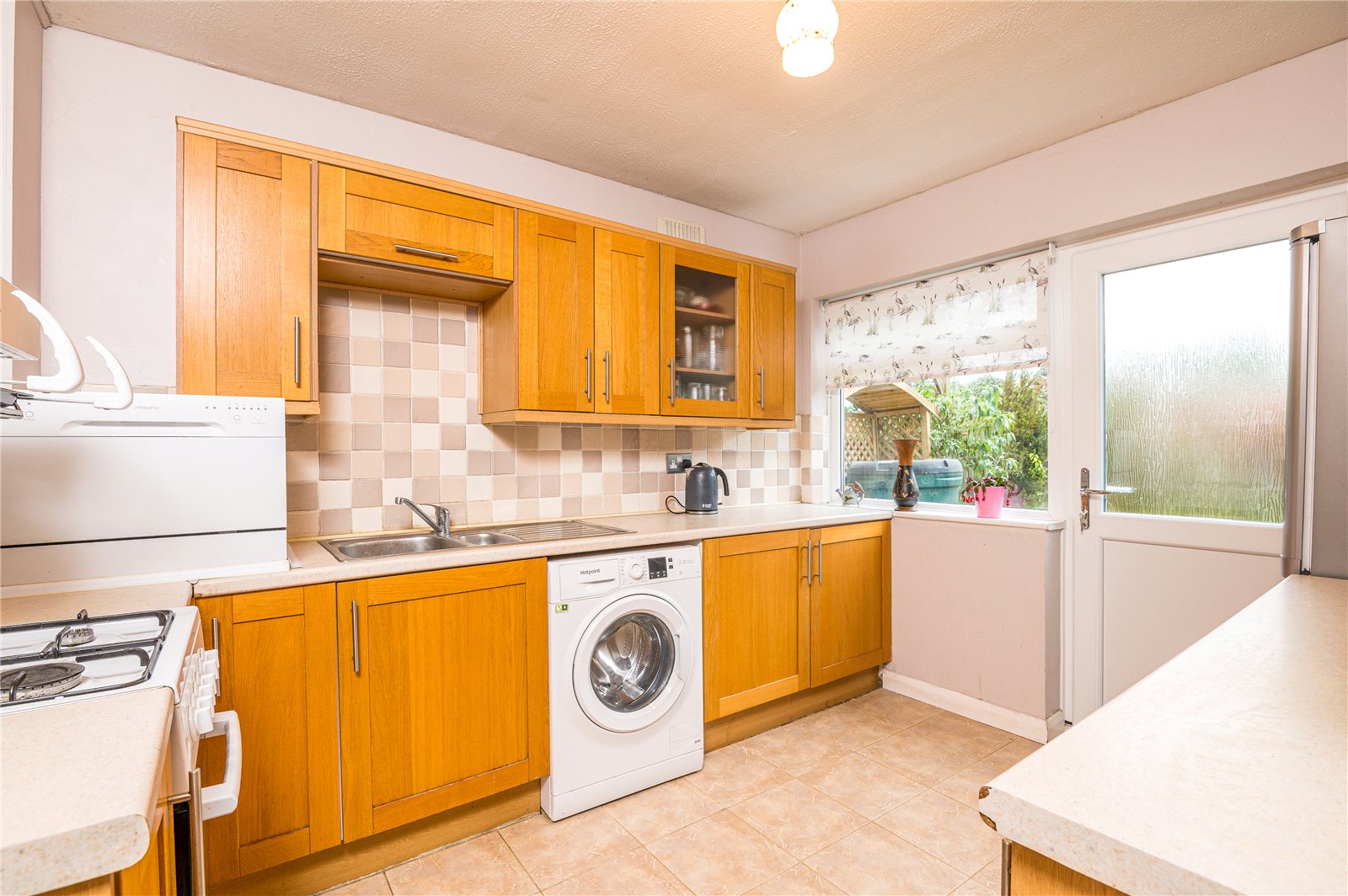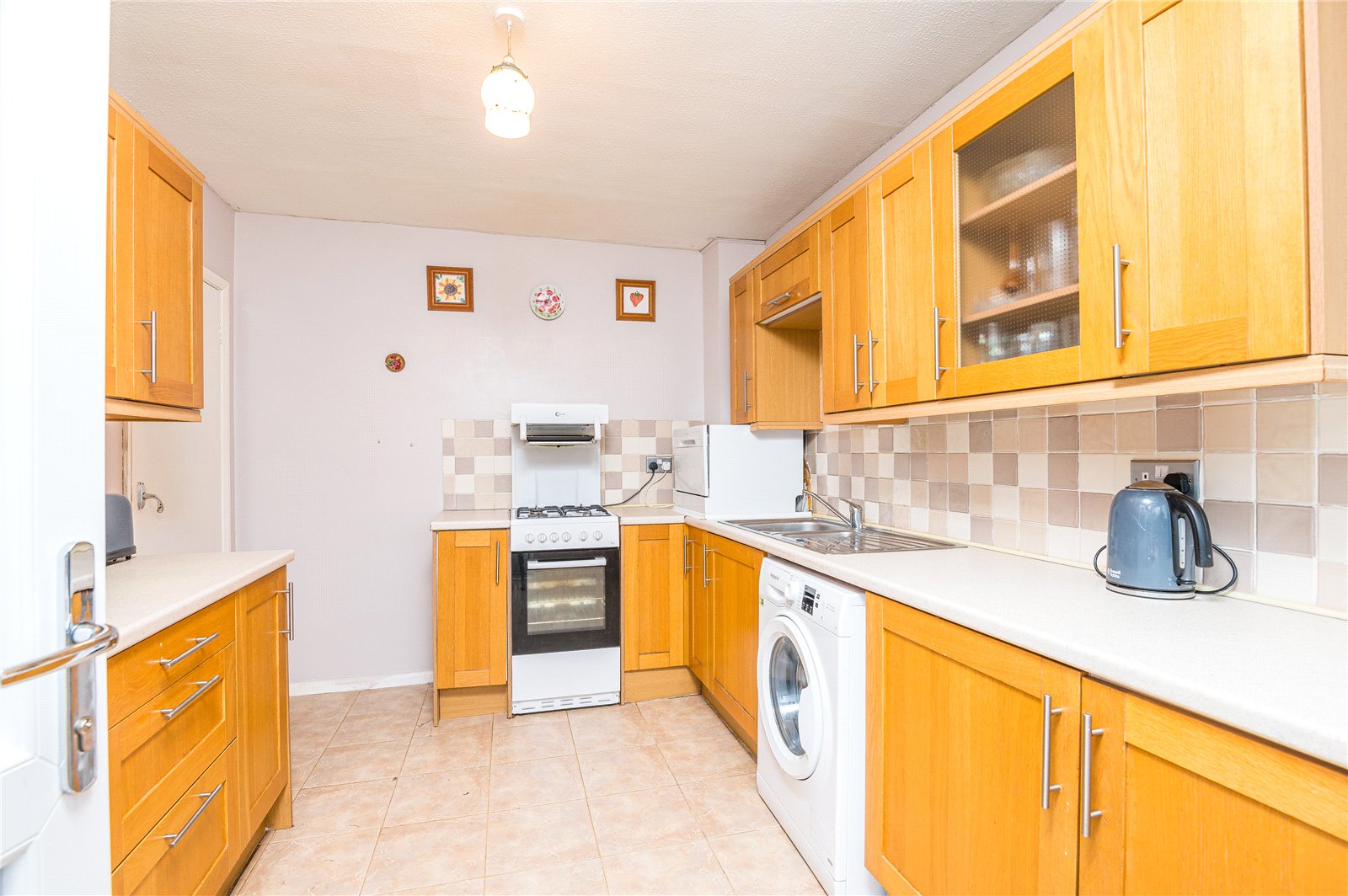 Upvc double glazed door to the rear aspect with window adjacent. The kitchen is modern and fitted with a range of base units with roll edge work surfaces incorporating a stainless steel single drainer sink unit with mixer tap. Further matching wall mounted storage units with glass fronted display door. Space for oven and fridge/freezer. Space and plumbing for washing machine. Part tiling to walls. Ceramic tiled floor. Textured ceiling.