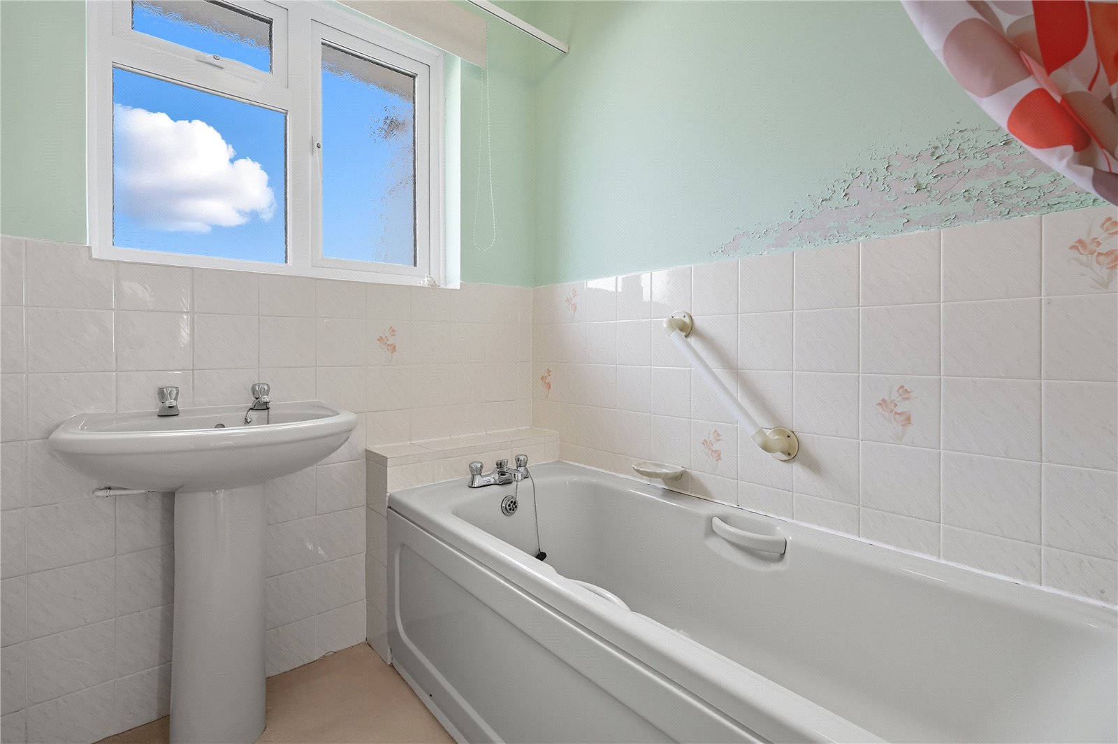 Panelled bath with hand grips, separately plumbed shower over. Pedestal wash basin. Half tiled walls. Radiator. Double glazed window to side.
