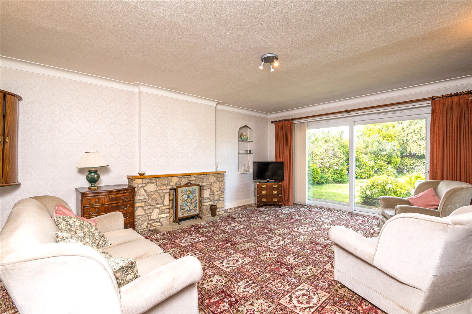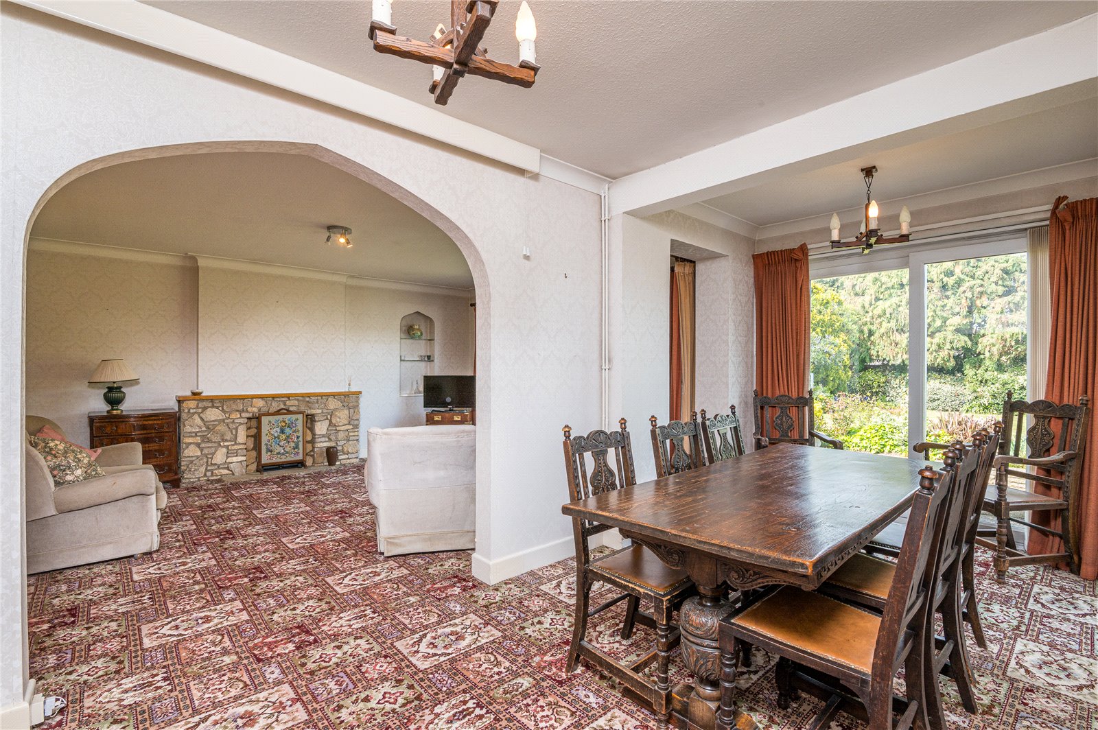 This bright well proportioned living room has wide double glazed sliding patio doors framing lovely views across the rear garden. Natural stone fireplace, open grate, timber mantle. Illuminated display niche. Two radiators. Coved ceiling. Archway leading to: