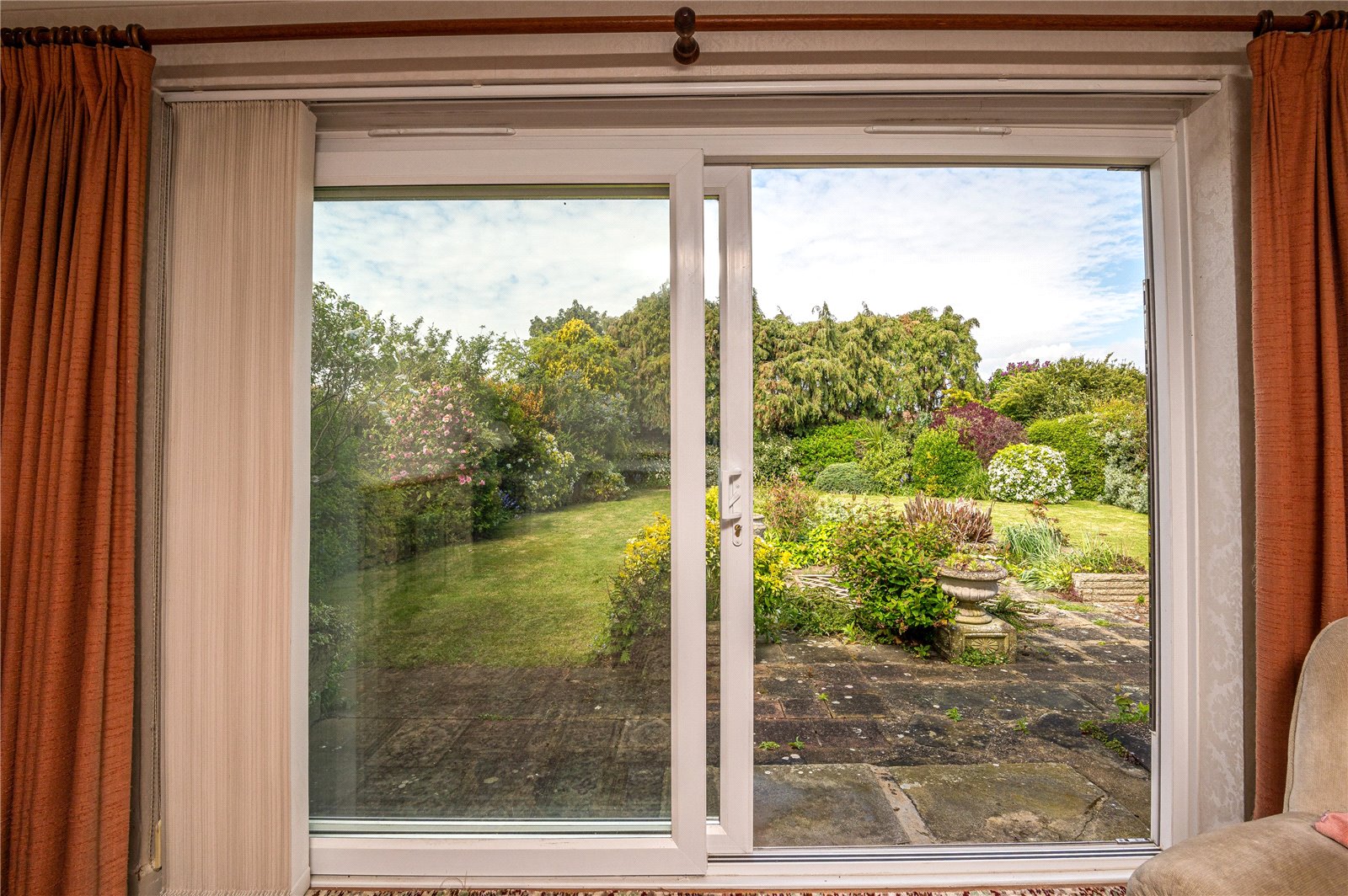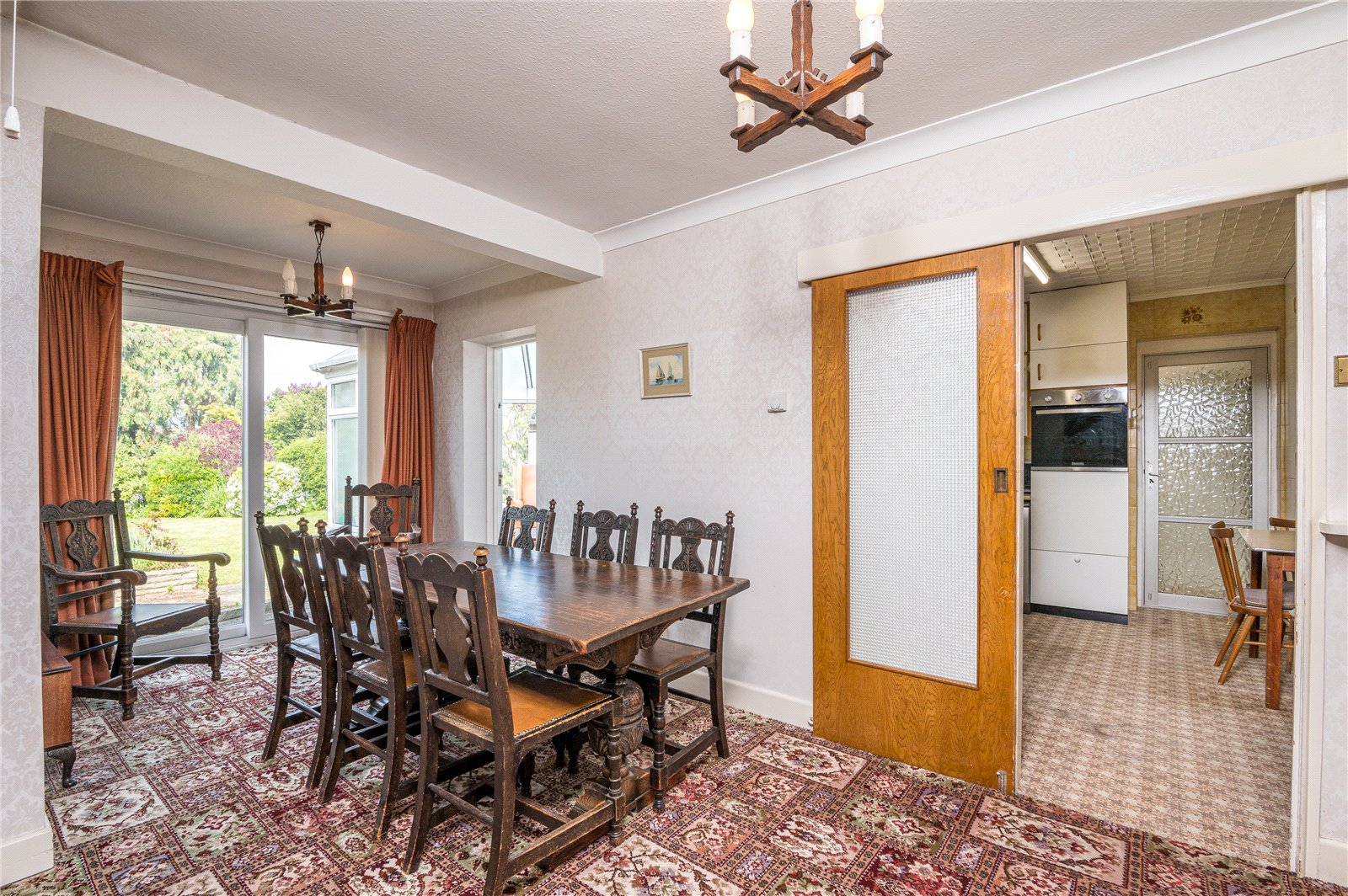 Double glazed sliding patio doors framing lovely views across the rear garden. Radiator. Coved ceiling. Glazed door to kitchen. Glazed door to: