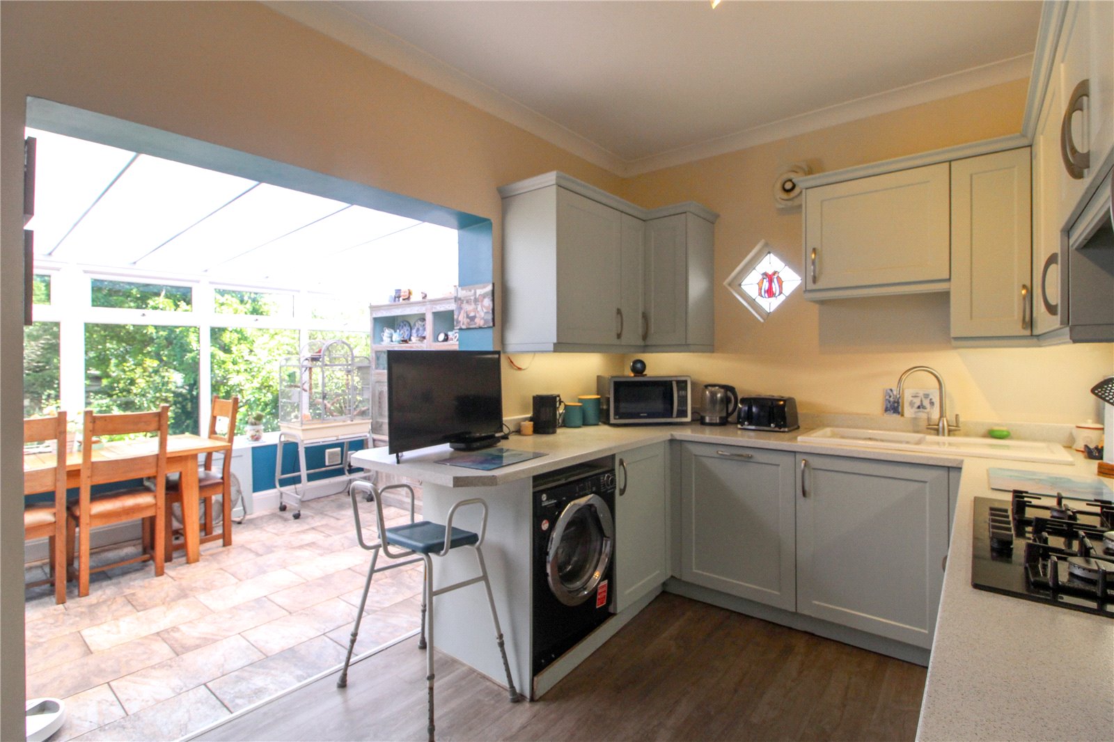 Original feature lead light window to side with decorative glazed insert. Fitted with a worksurface doubling up as a breakfast bar with lipped splashback, comprising inset enamel sink with chrome monobloc mixer tap and drainer unit, five ring gas hob with ceramic splashback and concealed extractor above, a comprehensive range of base cabinets incorporating integrated dishwasher with space and plumbing for washing machine and matching eye-level cabinets with pelmet lighting. Further full-height cabinetry features an integrated and eye-level oven with grill above and space for full-height fridge/freezer in adjacent recess. Wood effect laminate flooring. Smooth plastered walls. Coving to smooth plastered ceiling with ceiling light. Opening into Conservatory.
