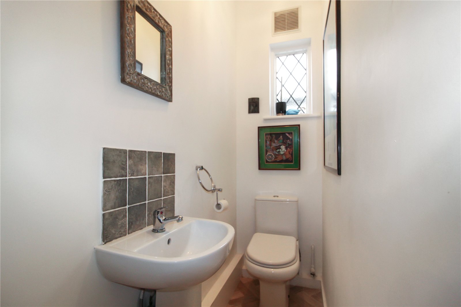 Lead light glazed window to side. Fitted with a modern two-piece white suite comprising pedestal enamel wash basin with chrome monobloc mixer tap and tiled splashback and low-level w.c. Tile-effect vinyl flooring. Smooth plastered walls and ceiling light.