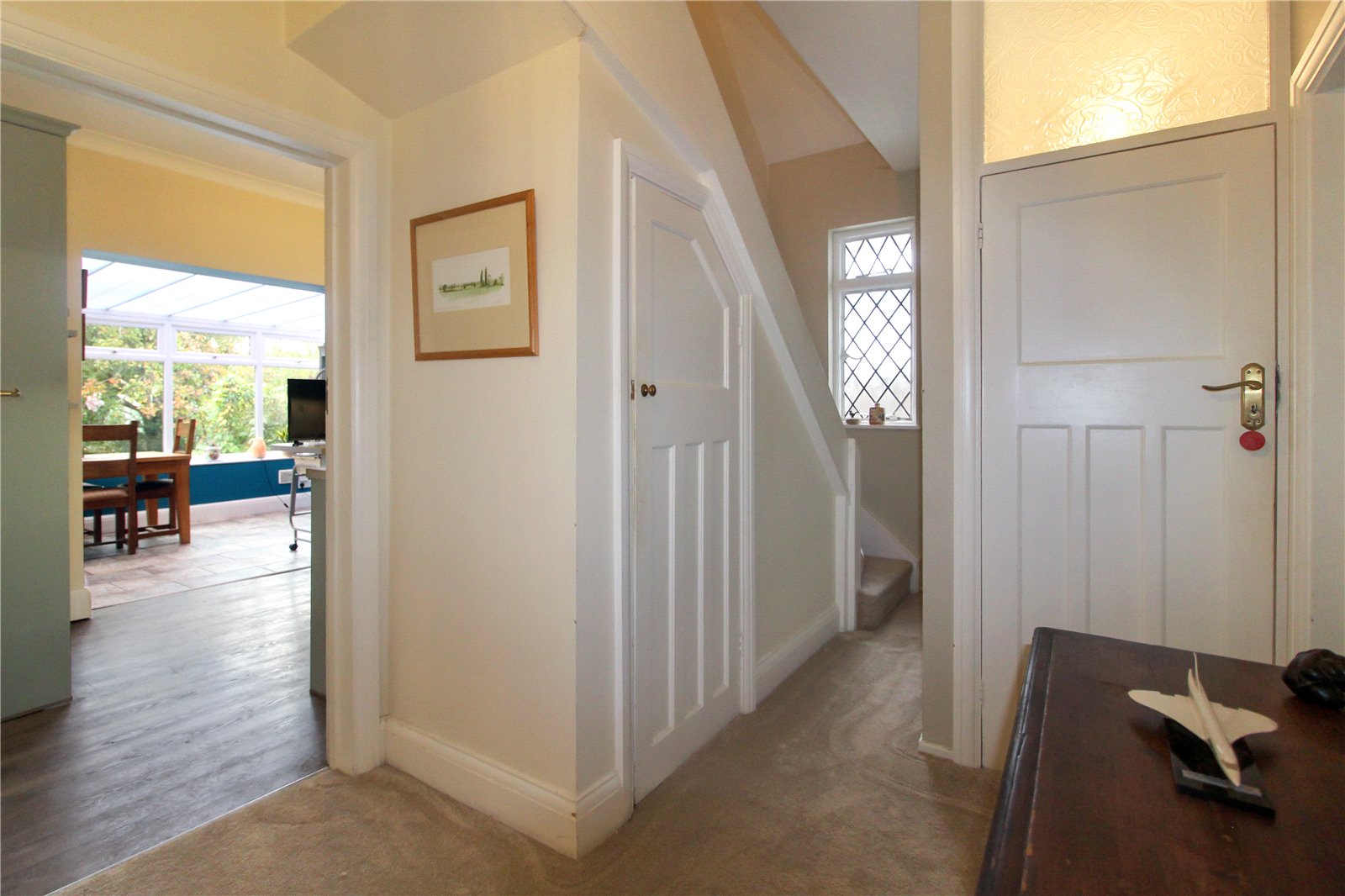 Entry through door with glazed insert into Entrance Hall. Lead light glazed window to side. Carpet to floor. Skirting. Radiator. Open window into Dining Room. Two ceiling lights. Doors to Living/ Dining Room, Kitchen, Bedroom One, Office, Cloakroom, storage cupboard housing electric consumer unit and gas and electric meters with cupboard above and understairs storage cupboard. Carpet to turning staircase leading to first floor landing with wall light.