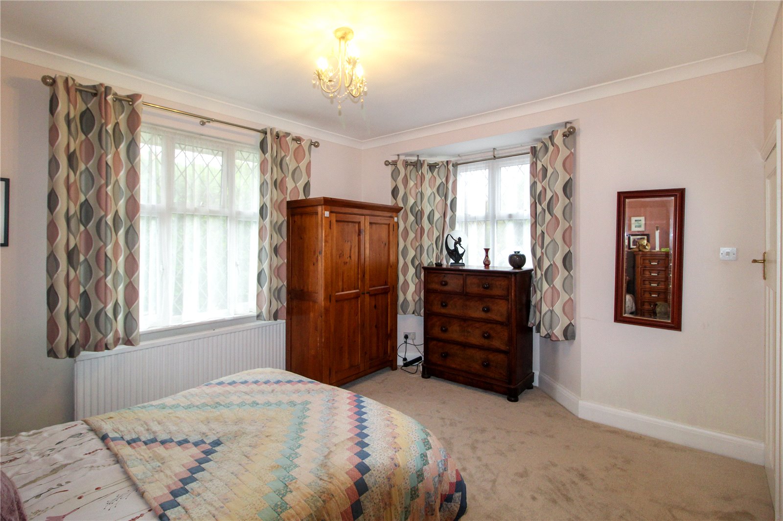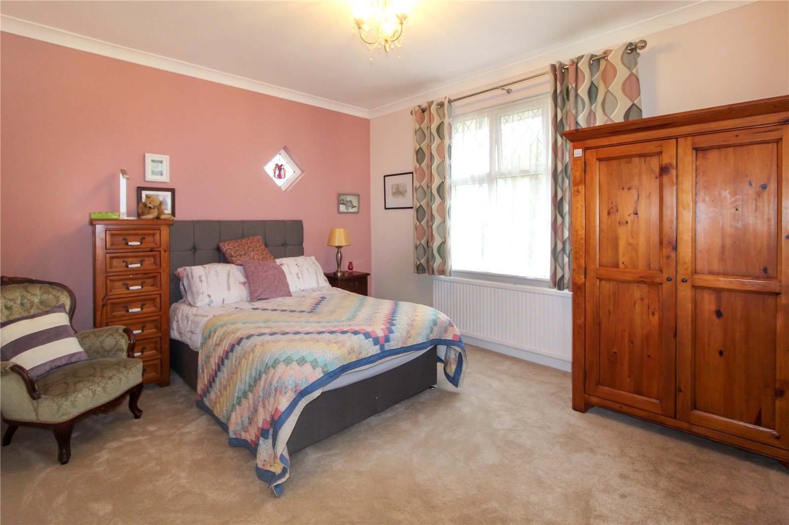 Triple aspect room with uPVC double glazed lead light bay window to side, uPVC double glazed lead light window to front and original feature lead light window to side with decorative glazed insert. Carpet to floor. Skirting. Radiator. Smooth plastered walls and coving to smooth plastered ceiling with ceiling light. Door to En-Suite.