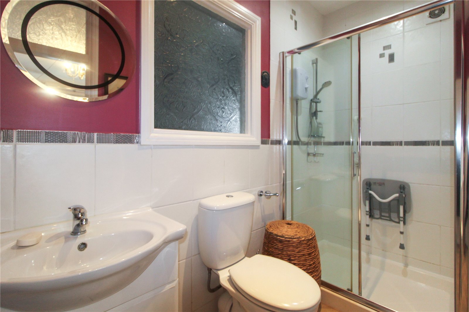 Opaque glazed window to rear. Fitted with a modern three-piece white suite comprising double width shower cubicle with Triton shower attachment, enamel wash basin with chrome monobloc mixer tap set upon vanity unit with cupboards under and low-level w.c.. Tile-effect vinyl flooring. Heated towel rail. Tiling to half-height with smooth plastered walls to the remainder. Extractor. Smooth plastered ceiling with recessed LED spotlights.