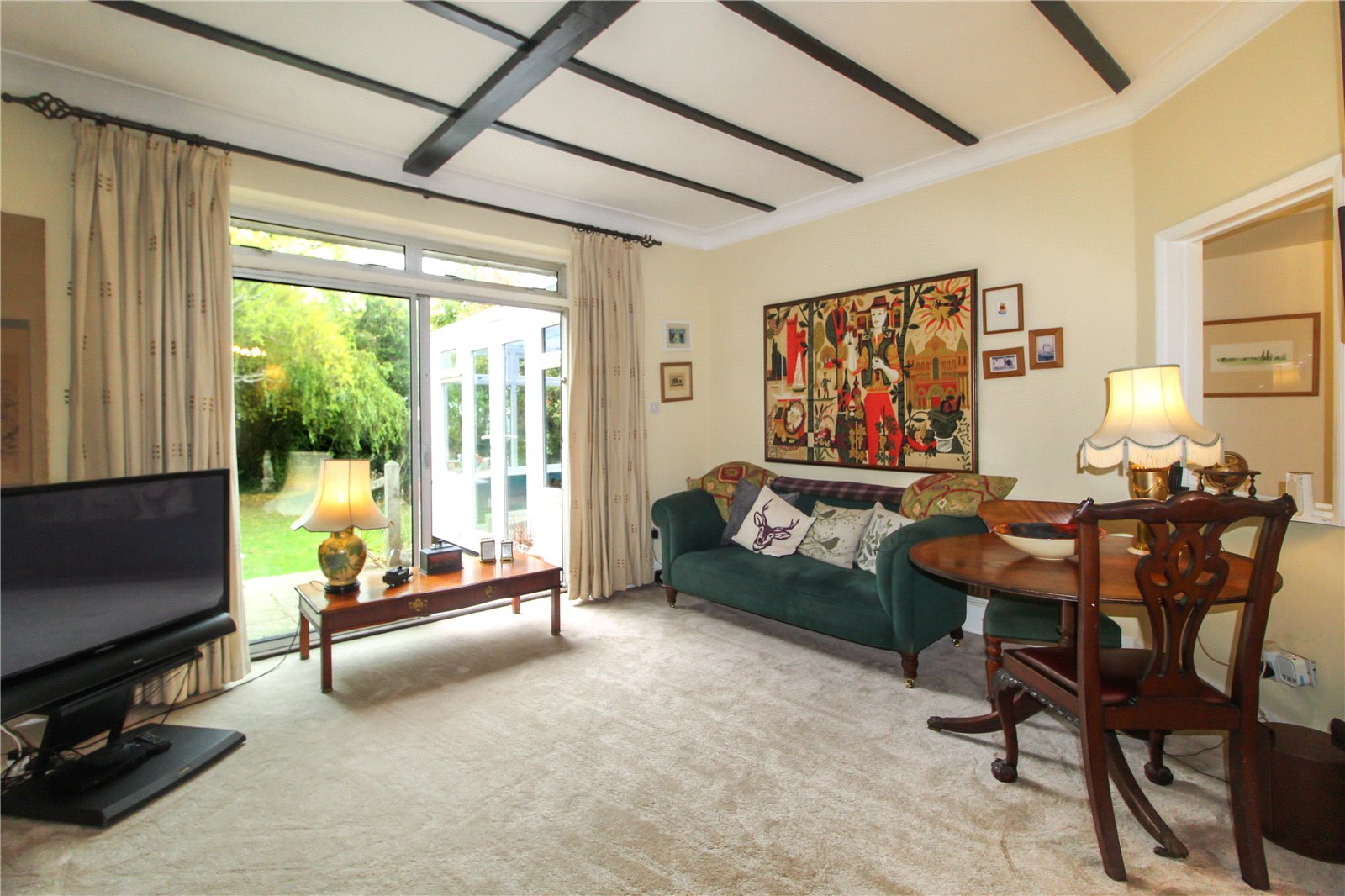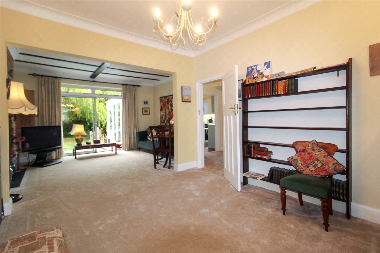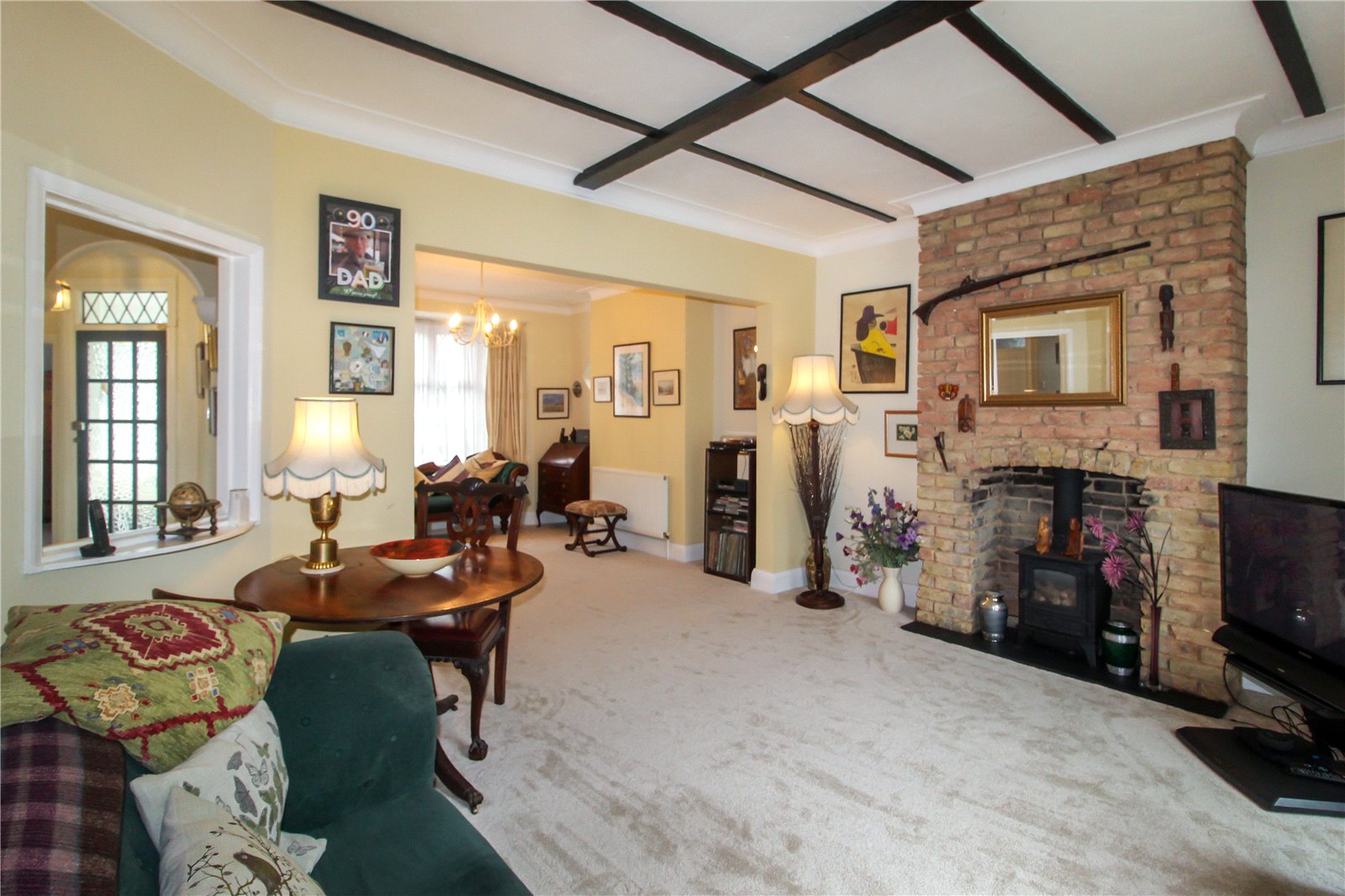 Triple aspect room with uPVC double glazed lead light bay window to front, double glazed sliding doors to rear out to garden and original feature lead light window to side with decorative glazed insert. Original feature brick working fireplace with stove. Carpet to floor. High-lipped skirting. Two radiators. Smooth plastered walls and coving to ceiling with decorative beams to ceiling at rear and ceiling light to front.