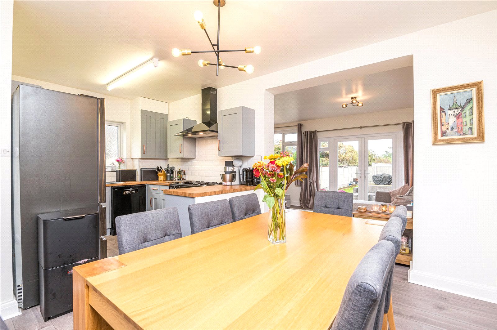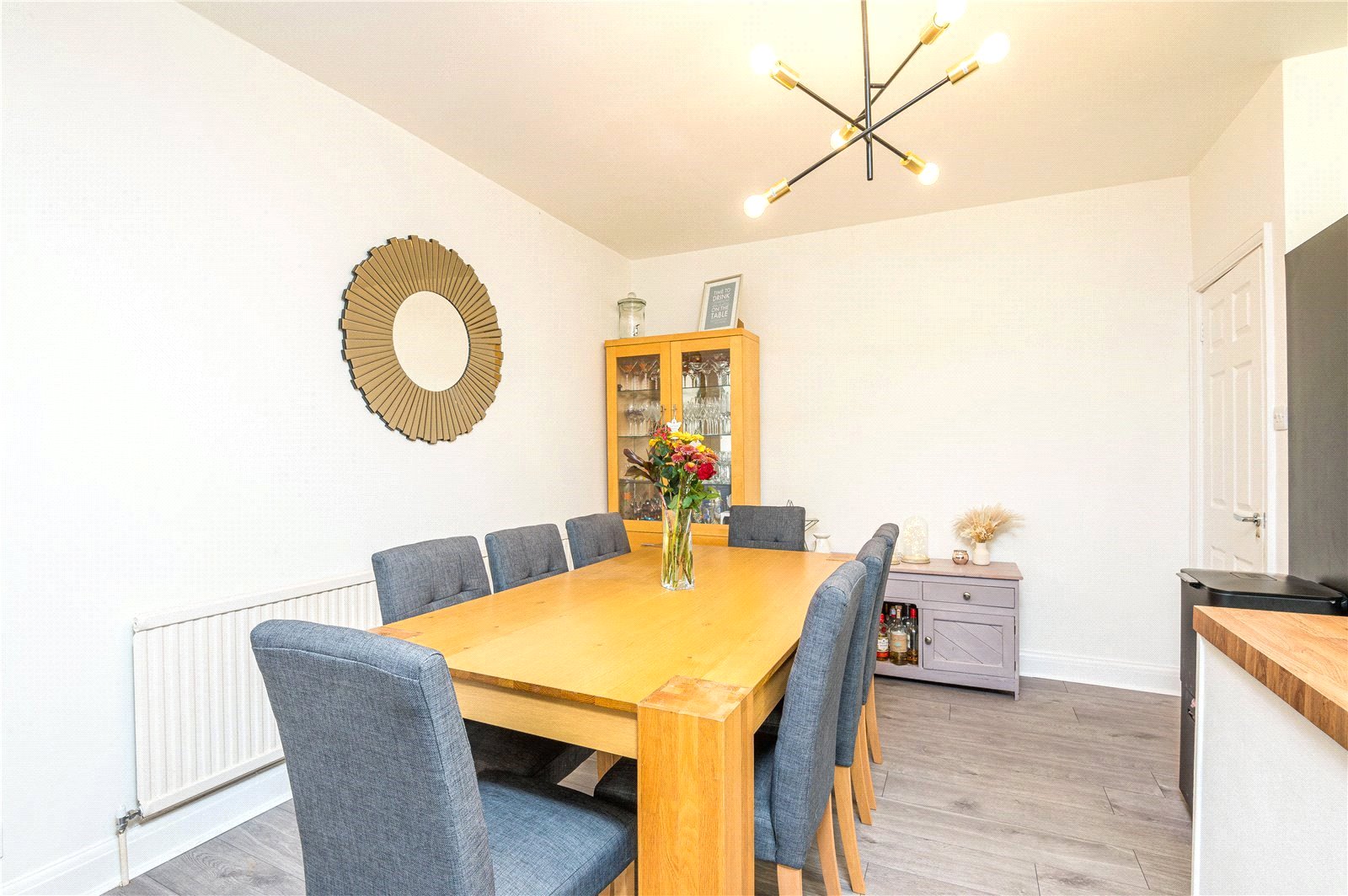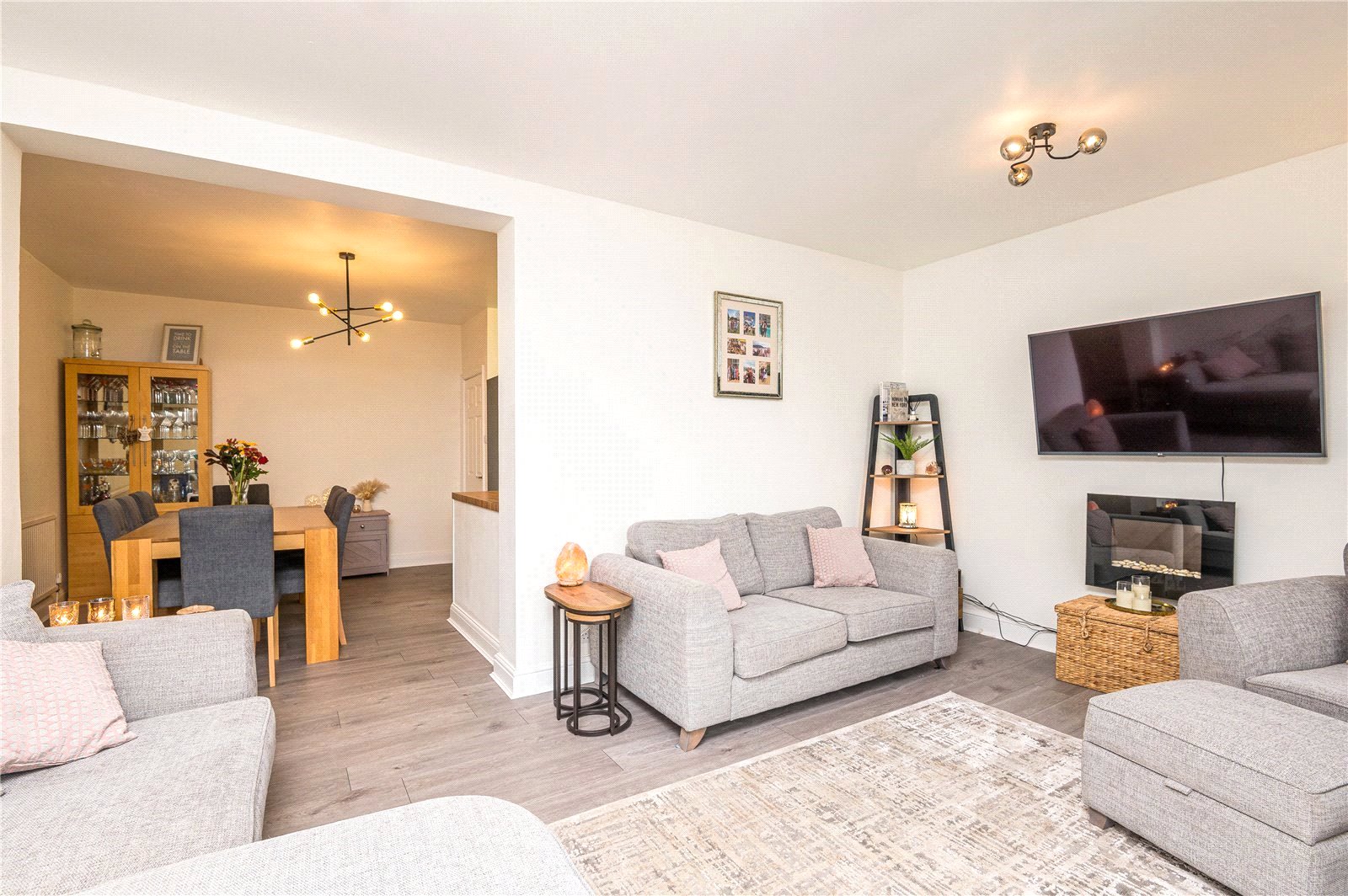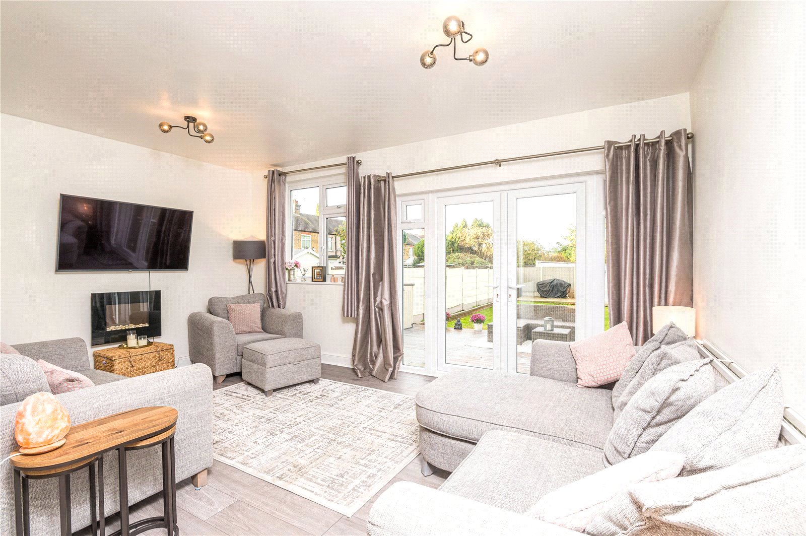 UPVC double glazed French door to rear with full height windows adjacent. Further UPVC double glazed window to rear. Wall mounted radiator. Feature wall mounted electric fire. Wood effect laminate flooring throughout. High level skirting. Smooth plastered ceilings.