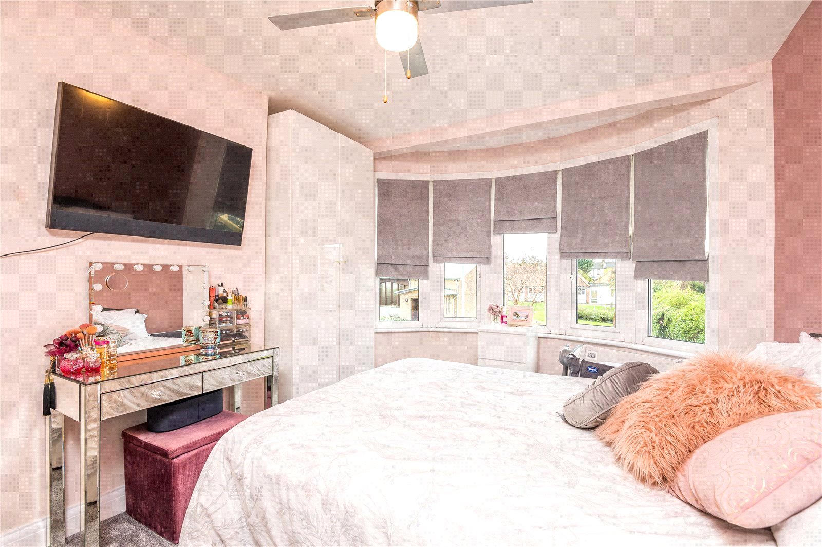 Into bay. Large UPVC double glazed bay window unit to front. Wall mounted radiator with fitted radiator cover. High level skirting. Smooth plastered ceiling. Ceiling light with integrated fan.