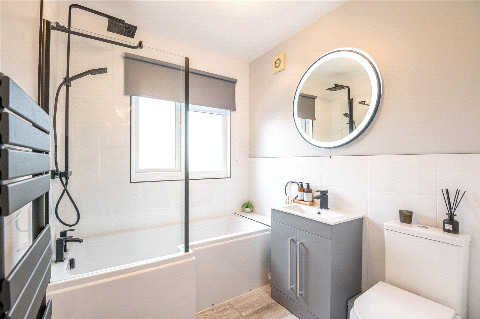 UPVC obscured double glazed window to front. Beautifully fitted with a three piece suite comprising low flush WC, wash hand basin with mixer tap and storage cupboard beneath. Panelled bath unit with mixer tap, separate wall mounted shower attachment. Rainfall showerhead with additional adjustable showerhead. Glass shower screen. Contemporary grey heated towel rail. Half height tiled walls. Fully tiled floors. Smooth plastered ceilings. Extractor fan.
