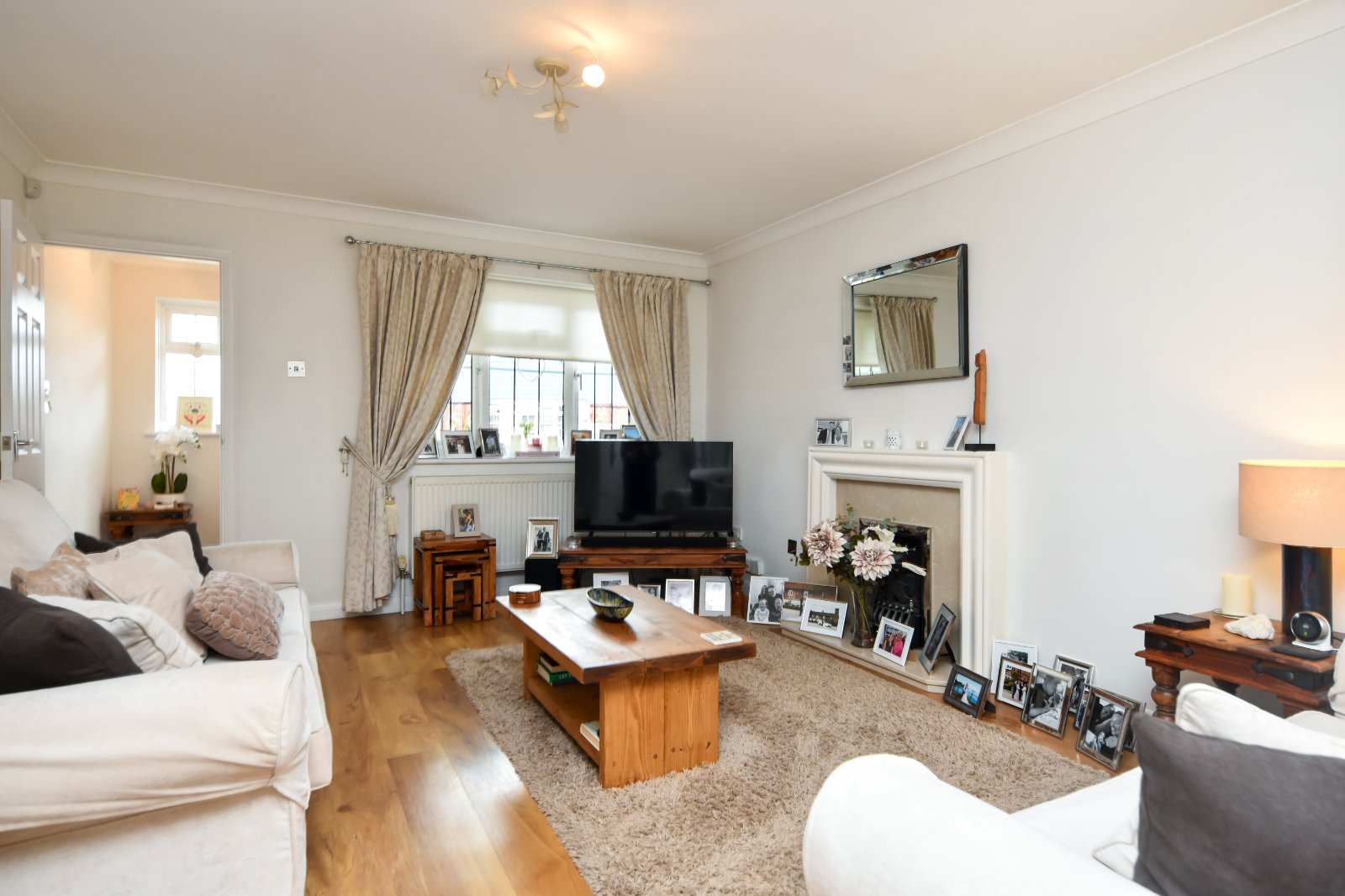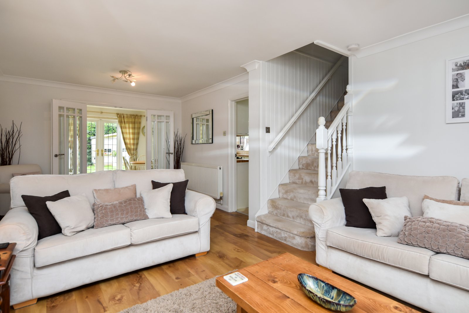 uPVC double glazed leaded window to front aspect allowing excellent natural light. Two radiators. Attractive natural stone feature fireplace with electric coal effect fire inset, creating a central focal point. Stairs rising to first floor accommodation with spindle balustrade. Thermostat control panel. Feature wood effect Karndean flooring. Pair of bevelled edge glazed doors opening to the Dining area of the Kitchen, with additional panelled door to Kitchen, enhancing the flow of the living space. Coving to smooth plastered ceiling.