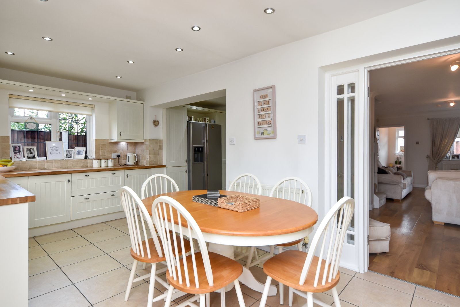 uPVC double glazed leaded windows to side and rear aspects together with uPVC double glazed leaded French doors opening to the garden, providing an abundance of natural light and an attractive outlook. The generous size Kitchen is fitted with a comprehensive range of cream Shaker-style eye and base level units with display cabinets and wine rack, complemented by wooden work surfaces over inset with recessed 'Butler style' sink unit with mixer tap over. Feature rustic effect tiled splashbacks. Integrated dishwasher. Concealed pelmet and display cabinet lighting. The Kitchen is arranged in a practical L-shaped design, with the return section offering further worktop space and cabinetry with an impressive 'Rangemaster' cooker comprising double ovens, separate grill, five-burner gas hob with large hotplate, all set beneath a wide extractor canopy. 'John Lewis' American-style fridge/freezer inset to cabinetry housing with brushed steel finish, water and ice dispenser (to remain). Two radiators. Tiled flooring extends throughout this sociable open-plan space which flows into the dining area, ideal for both everyday family use and entertaining. Tiled flooring. Panelled door providing access to garage and further door leading to hallway. Smooth plastered ceiling inset with recessed lighting.