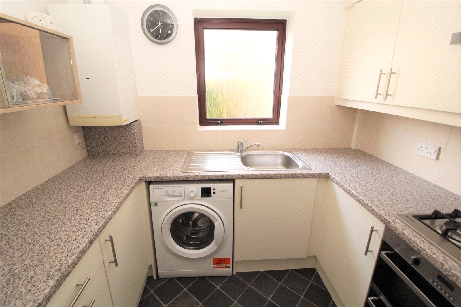 Fitted with single drainer stainless steel sink unit with mixer tap. Roll edge work surface with base cupboards and drawers under. Built-in four ring gas hob with oven below and stainless steel extractor hood over. Matching eye level cabinets. Space and plumbing for washing machine. Space for upright fridge/freezer (washing machine and fridge/freezer to remain). Wall mounted boiler serving central heating and domestic hot water. Tiling to working surface areas. Smooth plastered walls. Coving. Upvc double glazed obscure window to side.