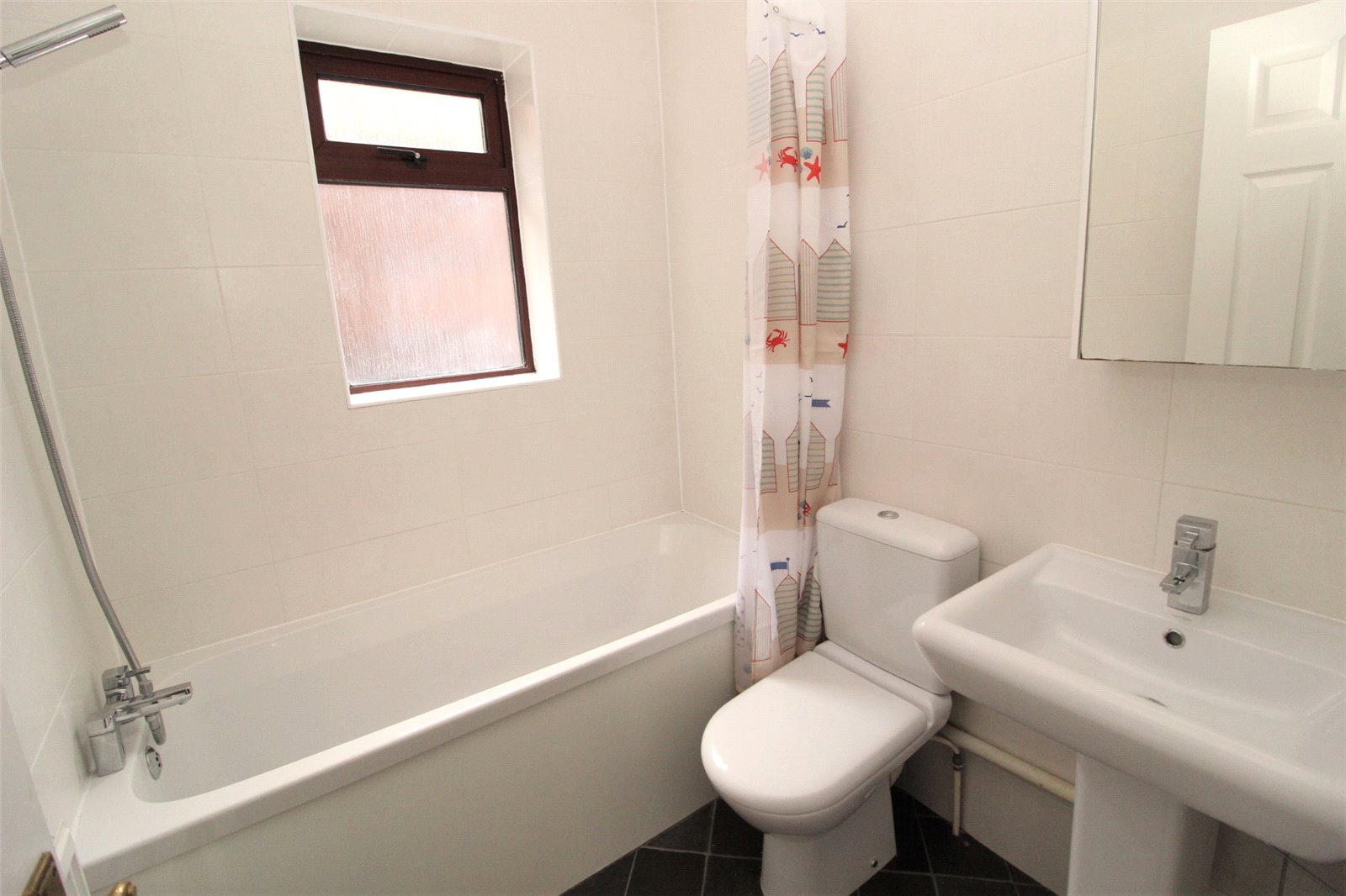 Fitted with modern white three piece suite comprising panelled bath with mixer tap, shower attachment with rail and curtain. Low flush w.c., Pedestal wash hand basin. Shaver point. Fully tiled walls. Single radiator. Double glazed obscure window to side.