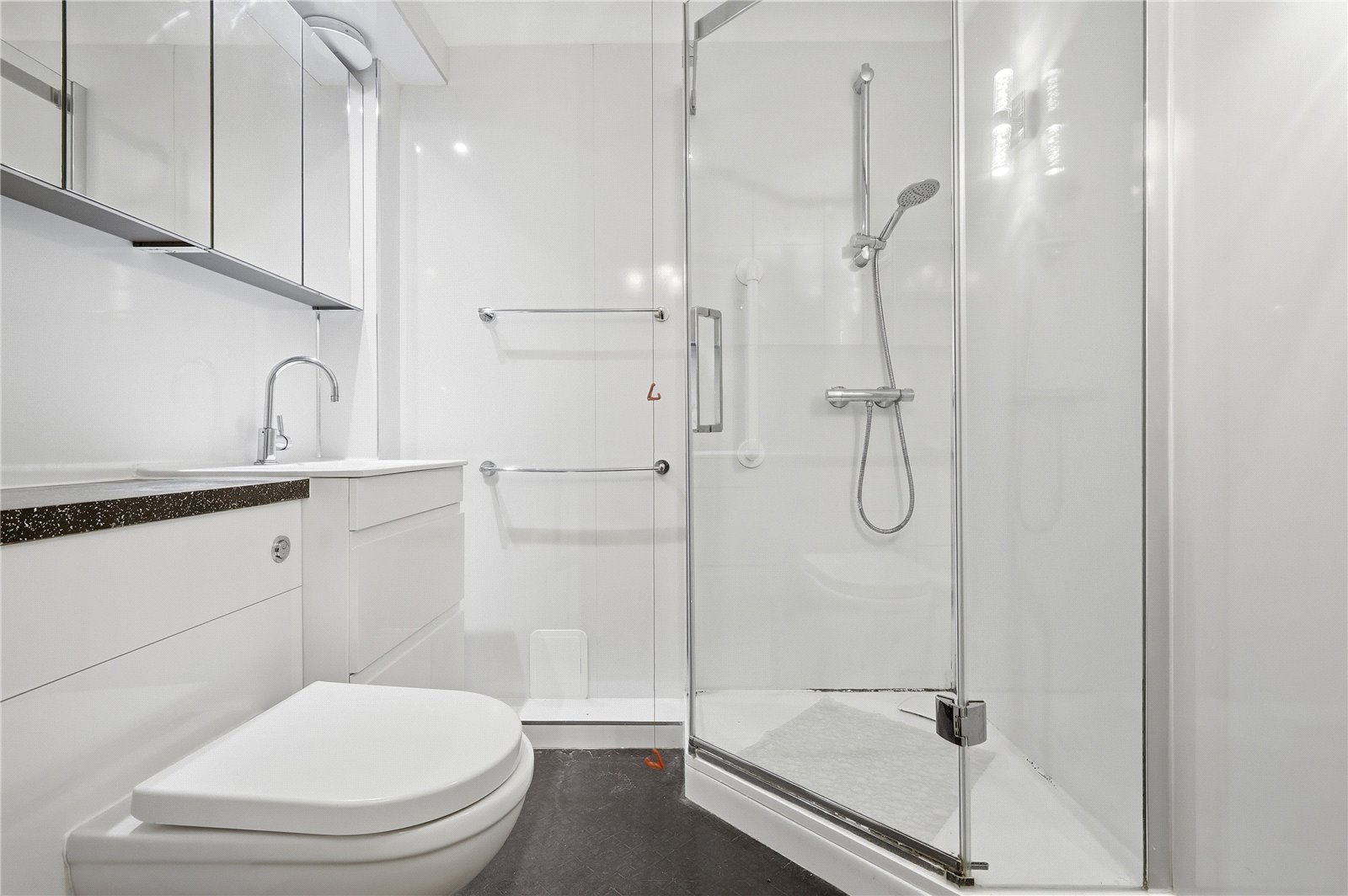 Fitted with a modern white three piece suite comprising of panelled shower cubicle with wall mounted shower unit and shower screen. Vanity wash hand basin with stainless steel mixer tap and cupboard under. Low level WC with concealed cistern. Vanity unit with drawers. Matching wall mounted storage units and mirror fronted doors. Panelling to walls. Coved cornicing with textured ceiling. Extractor fan. Shaver point.