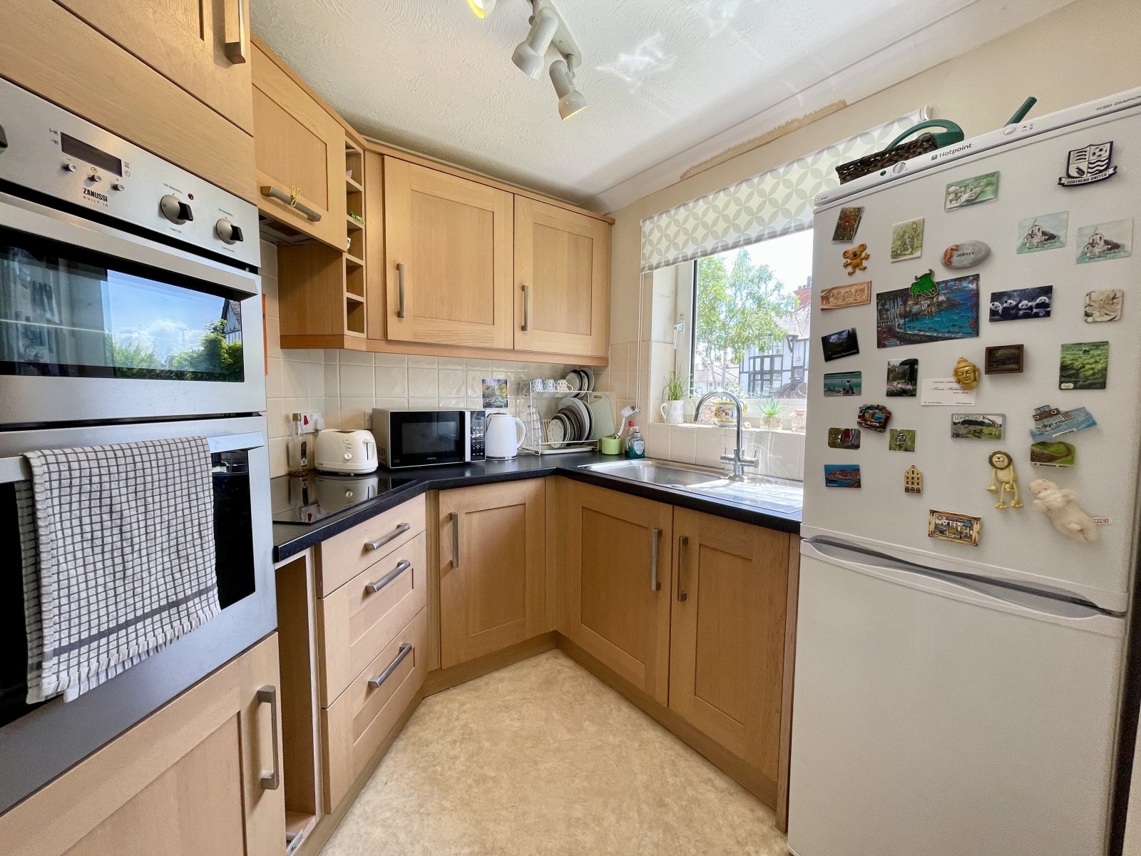 UPVC double glazed window to front. Kitchen is fitted with a modern range of wooden effect base and eye level cabinets incorporating a rolled edge working surface. Inset stainless steel sink with mixer tap and drainer unit. Inset four burner induction hob with recessed extractor hood above. Integrated electric fan assist oven. Space for fridge/freezer. Tiled splashbacks. Vinyl flooring. Wall mounted electric fan heater. Coved ceiling. Emergency pull cord.