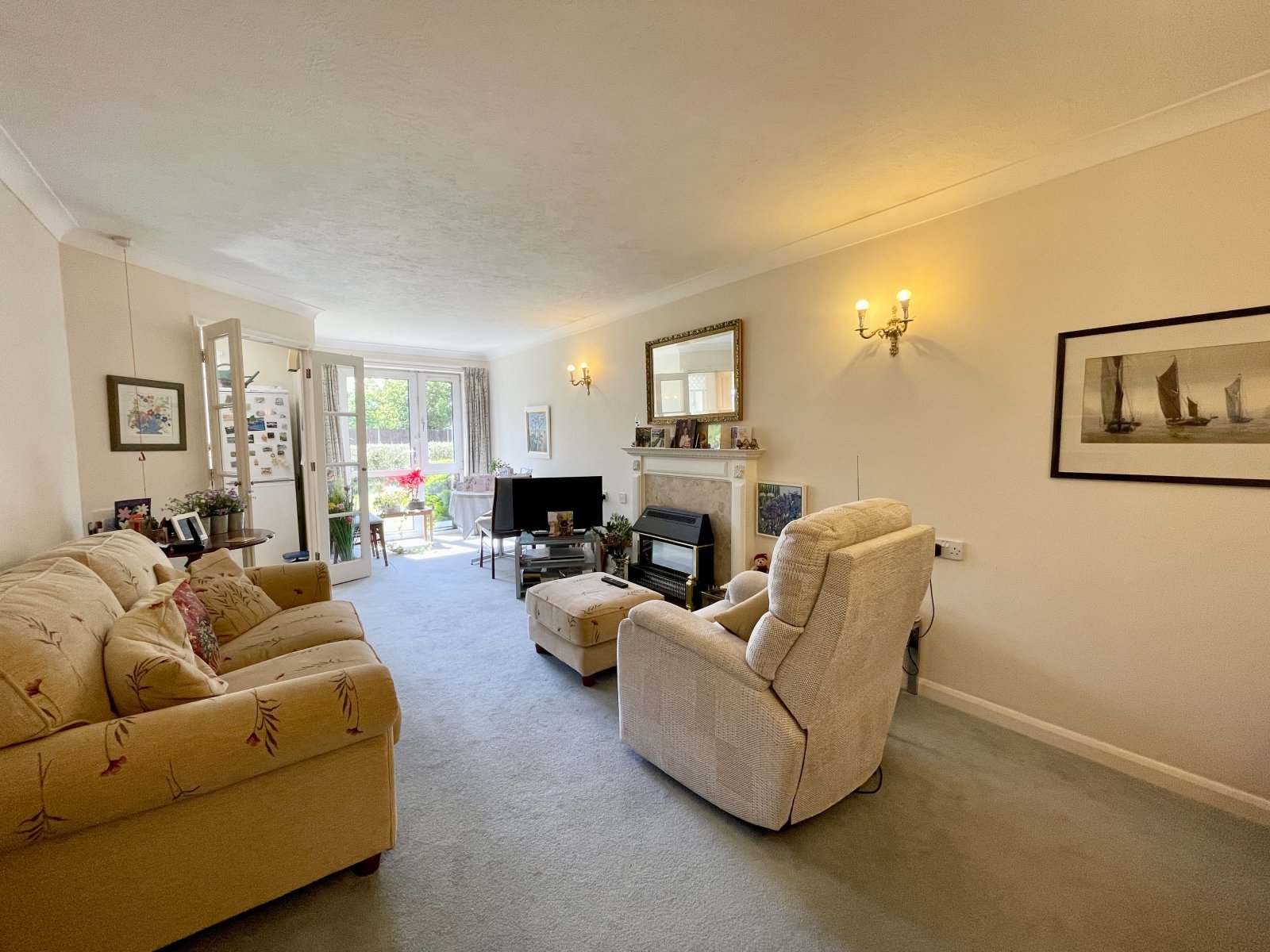 UPVC double glazed door to front leading directly on to front communal gardens. Full height double glazed window adjacent. Wall mounted electric storage heater. Feature fireplace with wooden mantle, stone hearth. Wall mounted lighting. Coved ceiling. Emergency pull cord. Glazed double doors to side provide access to the;