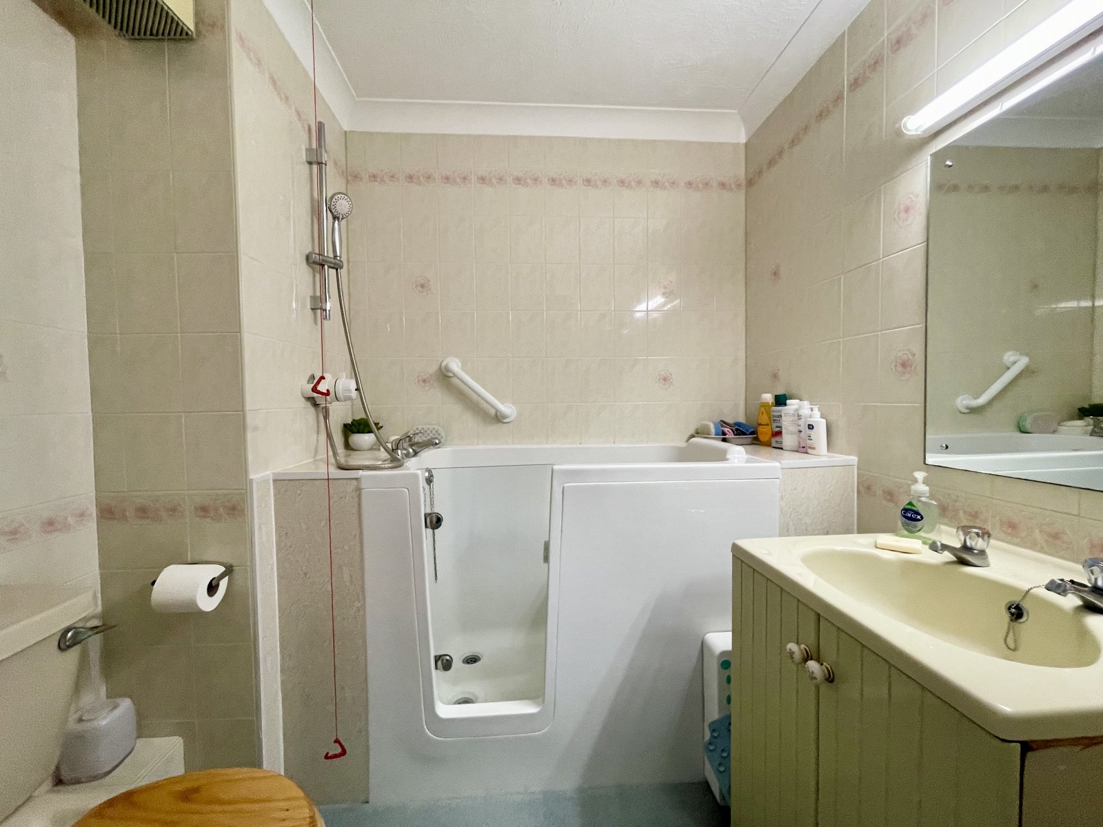 Fitted with a three piece suite comprising; Low flush WC. Wash basin with storage beneath, and mobility seated bath with mixer tap. Plus, over head shower mixer. Heated towel rail. Wall mounted fan heater. Wall mounted extractor fan. Fitted vanity mirror. Tiled walls.