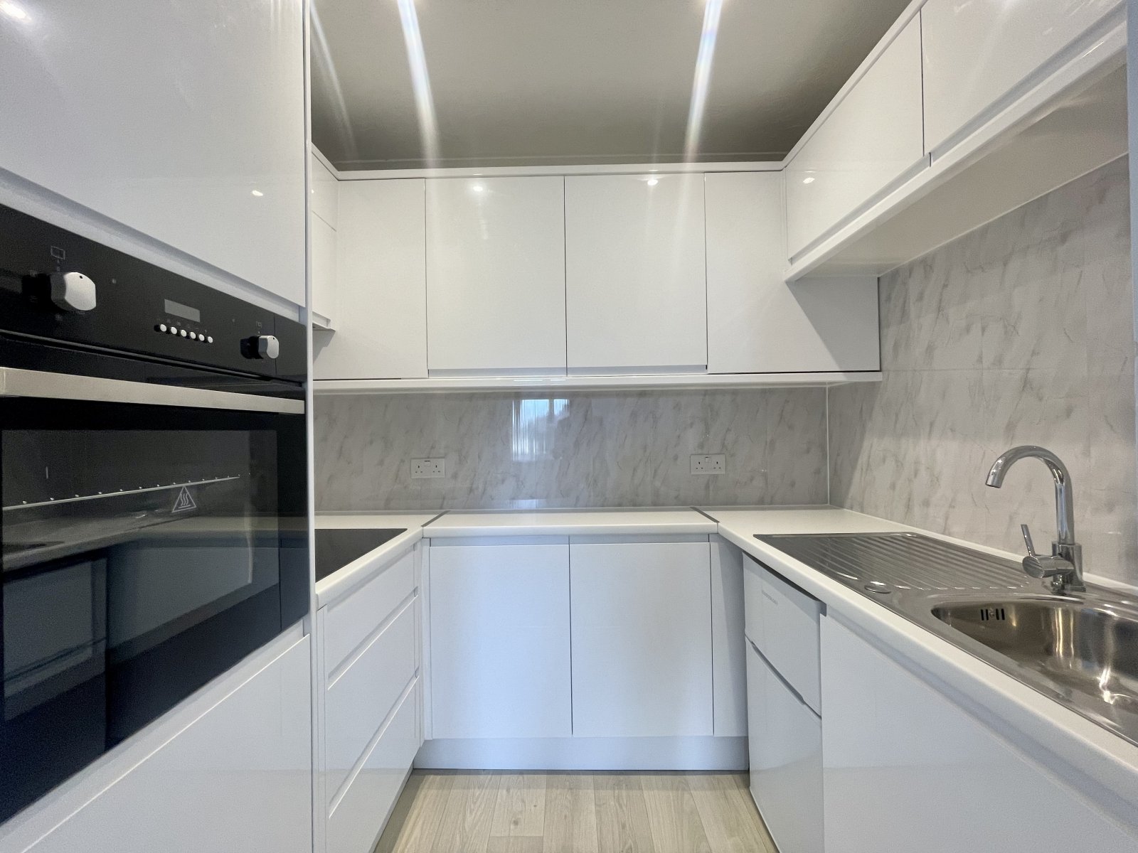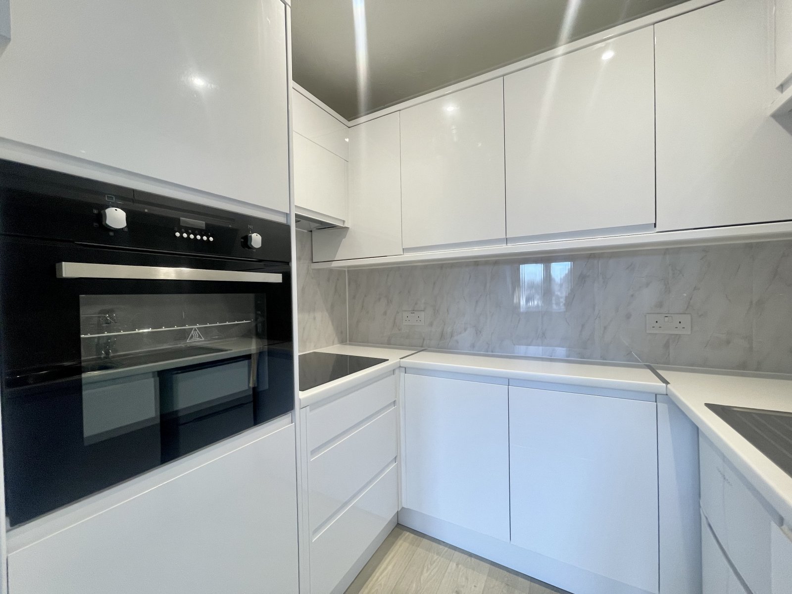 Fitted with a brand new range of high gloss base and eye level cabinets incorporating a rolled edge working surface, inset stainless steel sink with mixer tap and drainer unit. New Inset four burner ceramic hob with recessed extractor hood above. New Integrated fan assist oven. Space for under counter fridge/freezer (Brand new existing uit too remain). Panelled splash back. Wood effect vinyl flooring. Emergency pull cord system. Coved cornice to ceiling.