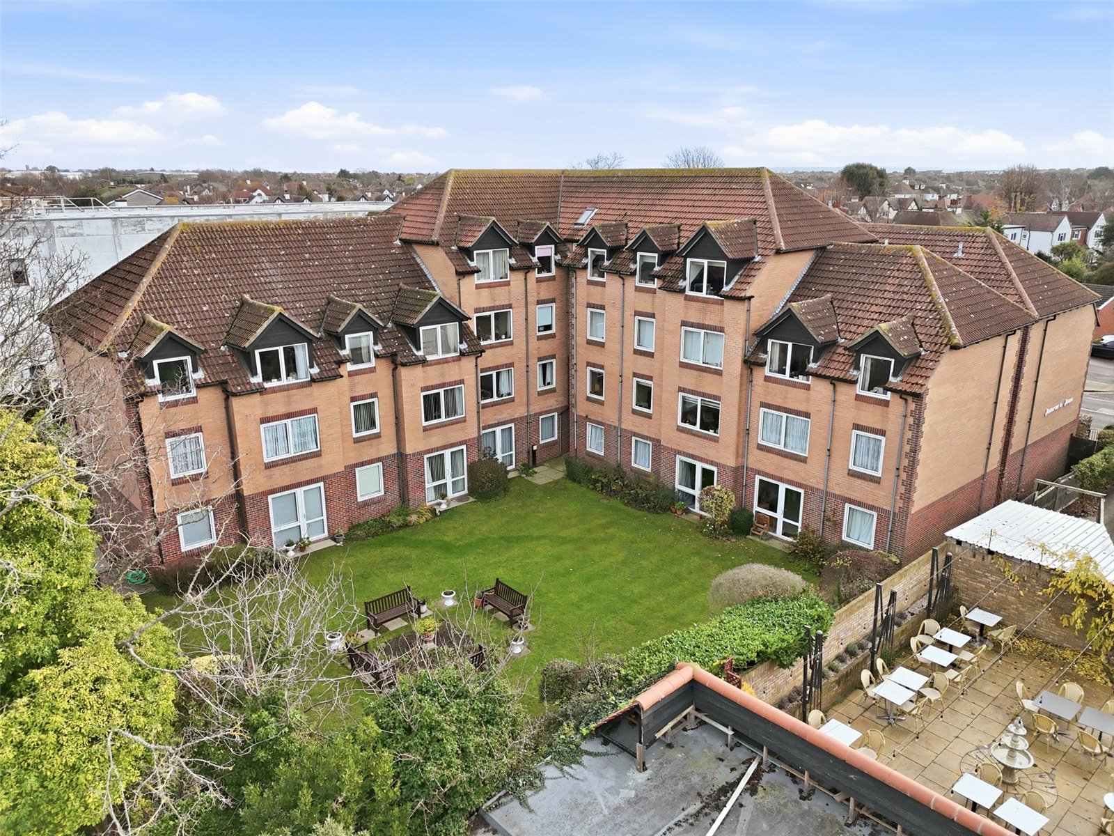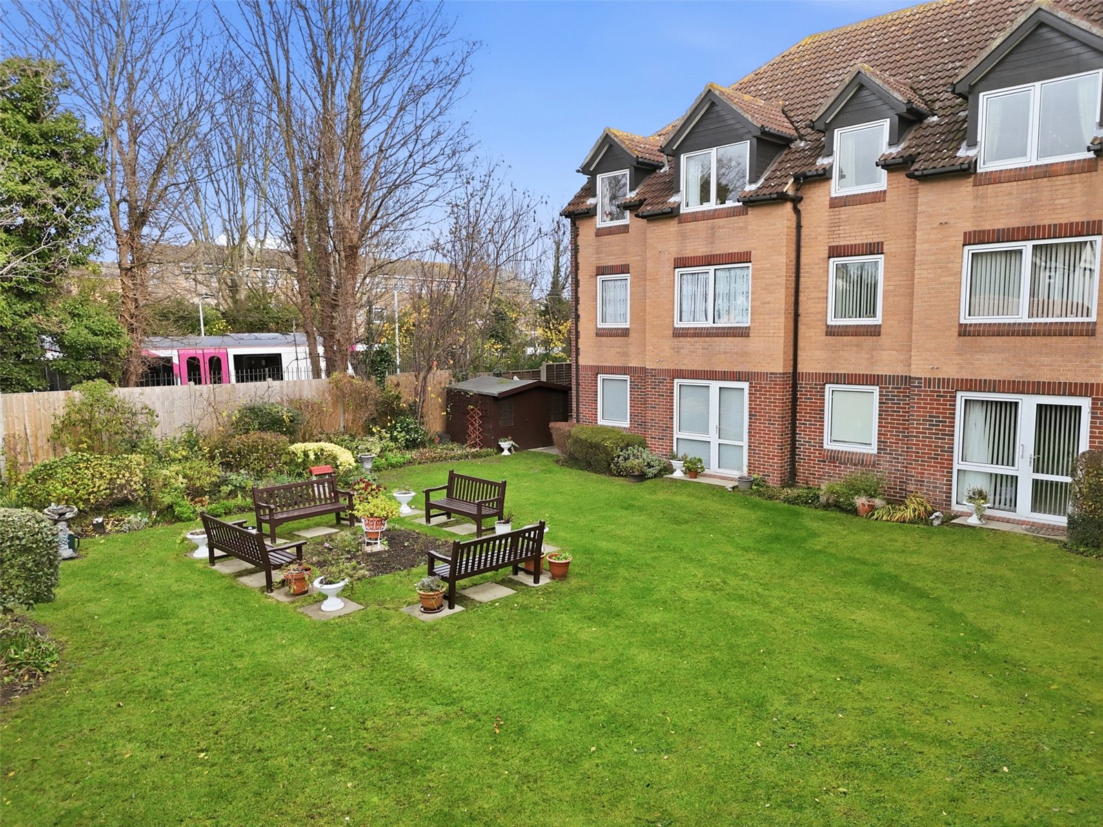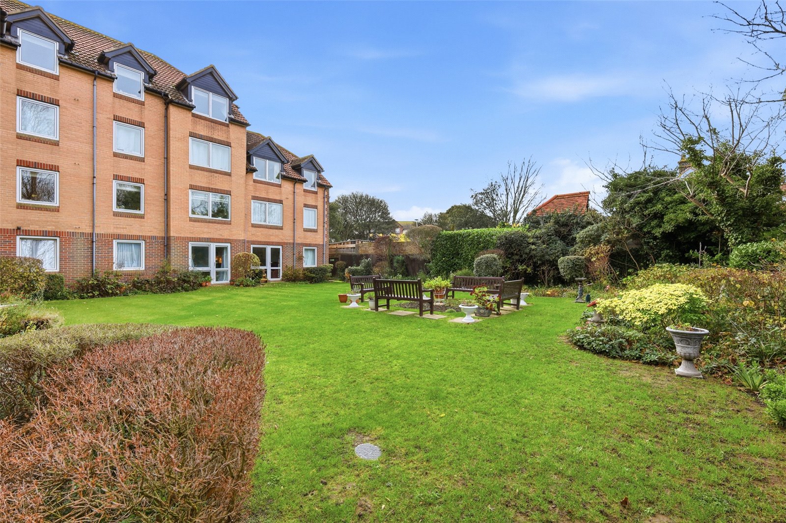 The development benefits from pretty and well maintained communal gardens which are laid to lawn with maturing trees and shrubs and seating areas.