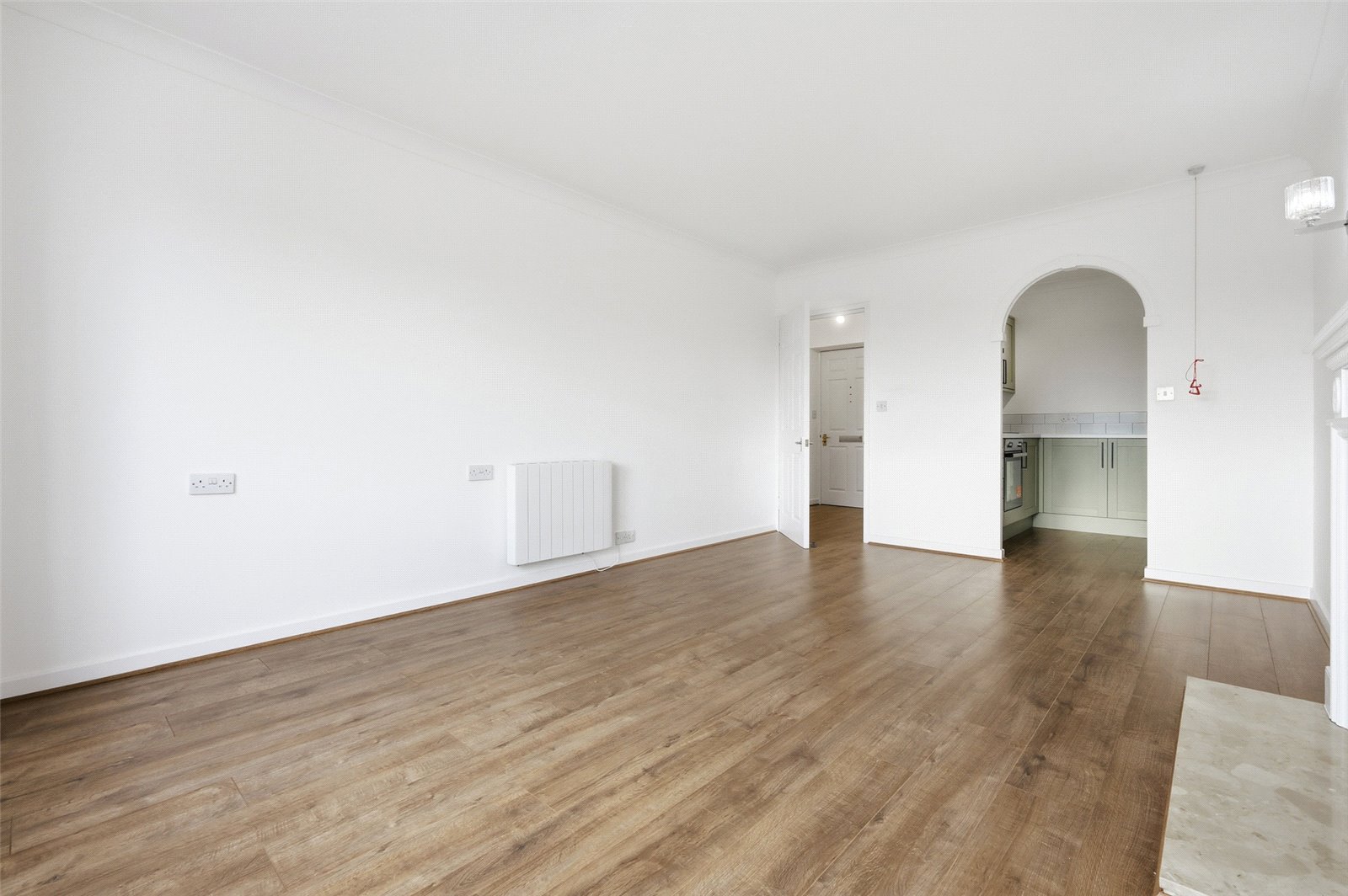 Large UPVC tilt and turn window to front enjoying a sunny south aspect. Wall mounted electric heater. Feature wooden mantle with stone hearth and insert. Wood effect laminate flooring. wall mounted lighting. Emergency pull cord. Coved cornice to ceiling. Open archway to rear provides access to the: