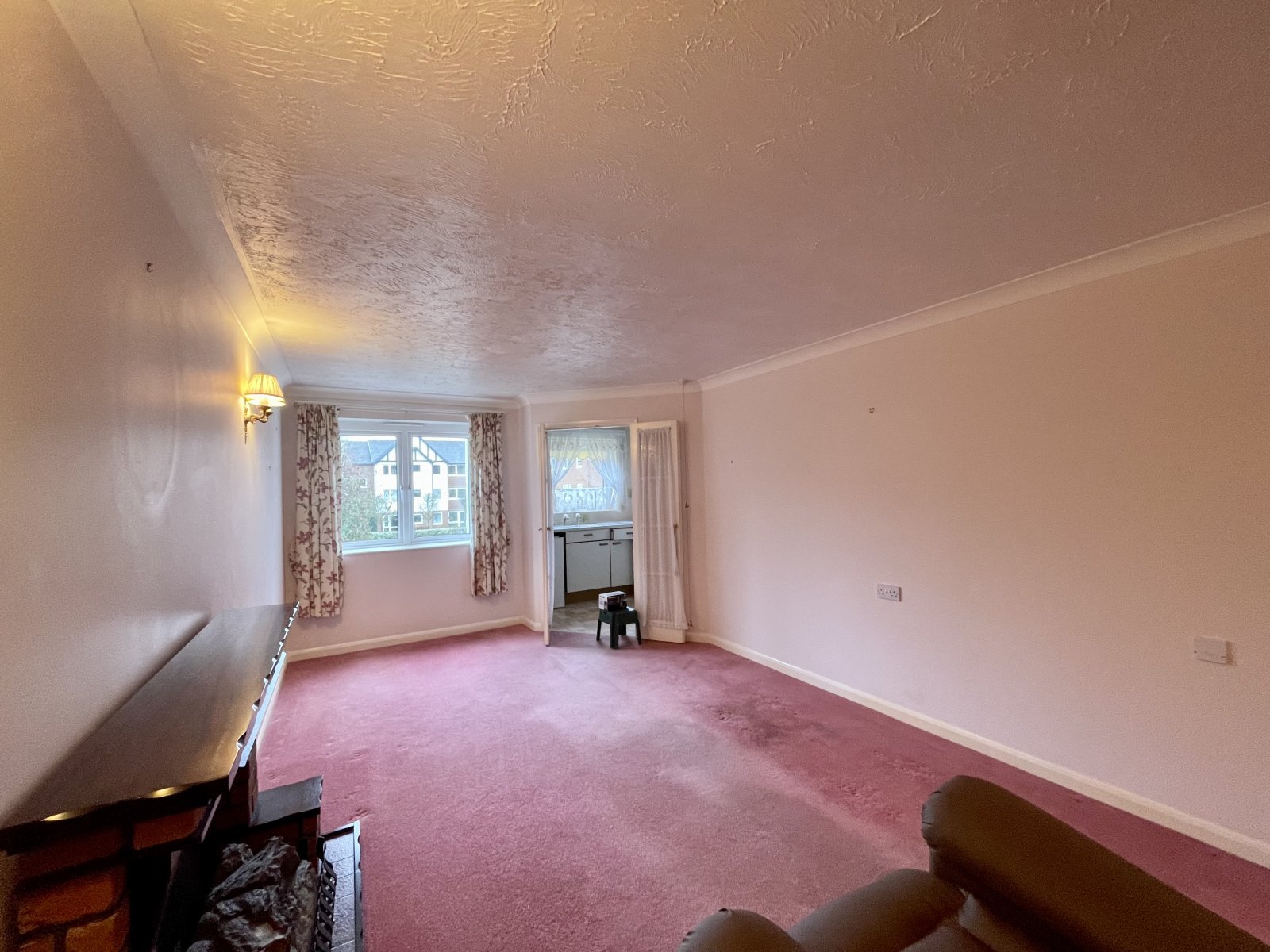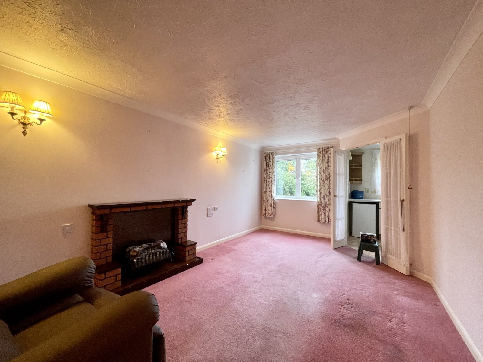 UPVC double glazed window to side. Wall mounted electric storage heater. Feature free standing fireplace with brick surround, wooden mantle, free standing electric fire. Emergency pull cord system. Wall mounted lighting. Coved cornice to ceiling. Double wooden doors with inset glazed panels provides access to: