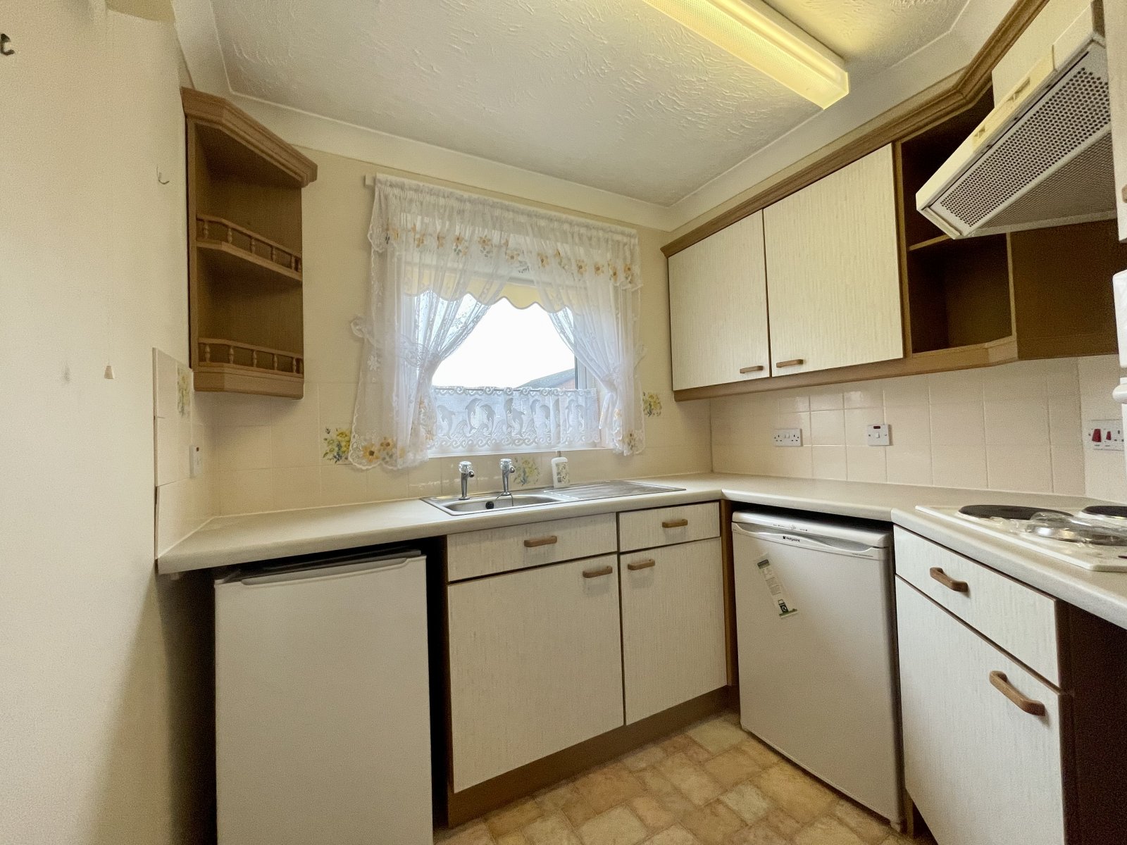 UPVC double glazed window to side. Kitchen is fitted with a range of base and eye level cabinets incorporating a rolled edge working surface, inset stainless steel sink, mixer tap and drainer unit. Inset four burner electric hob with extractor hood above. Integrated electric oven. Space for under counter fridge/freezer (existing to remain) . Fully tiled splash back. Tiled effect vinyl flooring. Wall mounted fan heater. Coved cornice to ceiling.