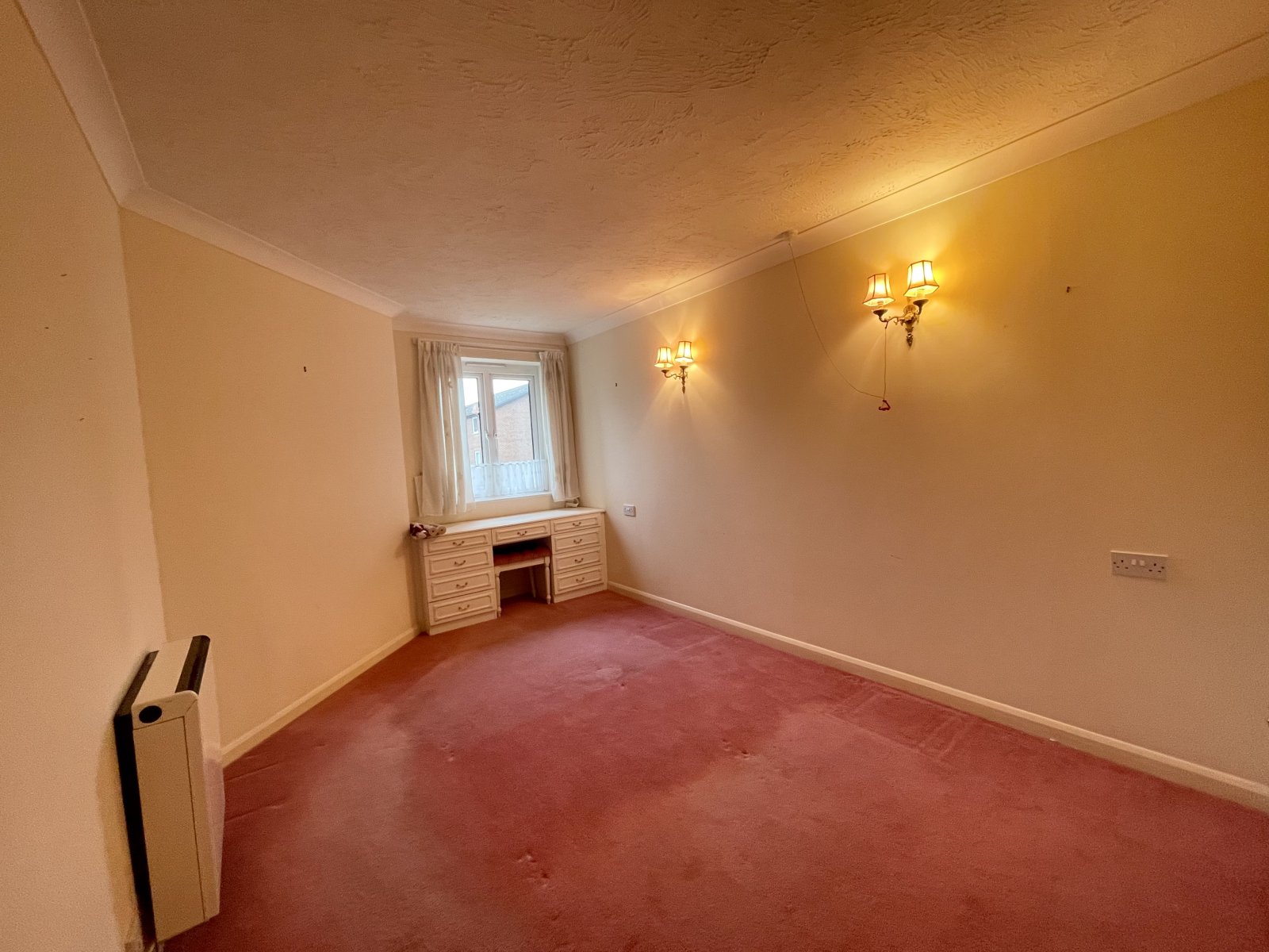 UPVC double glazed window to side overlooking communal gardens. Range of fitted wardrobe units. Electric storage heater. Wall mounted lighting. Fitted dressing table. Coved cornice to ceiling.