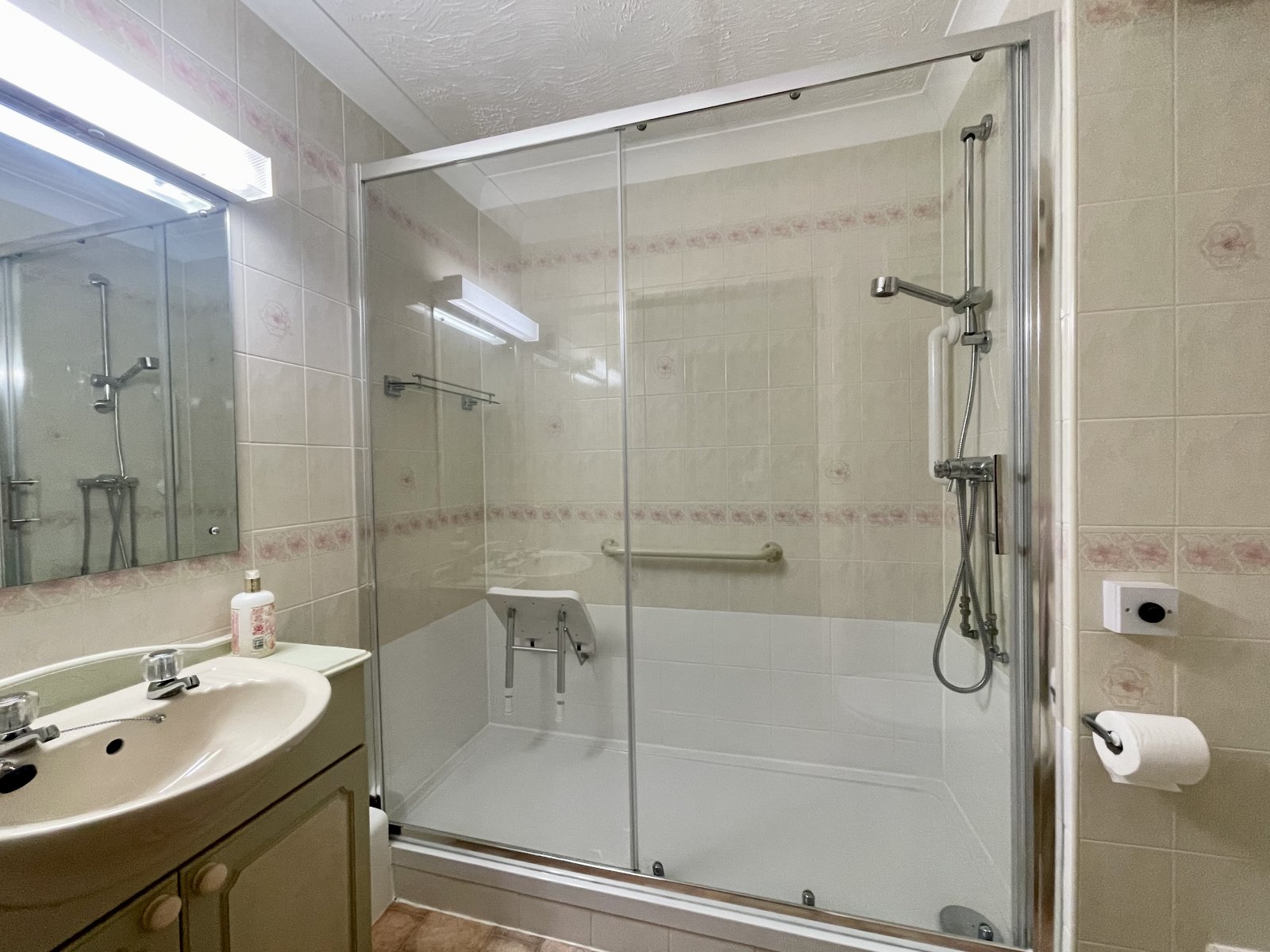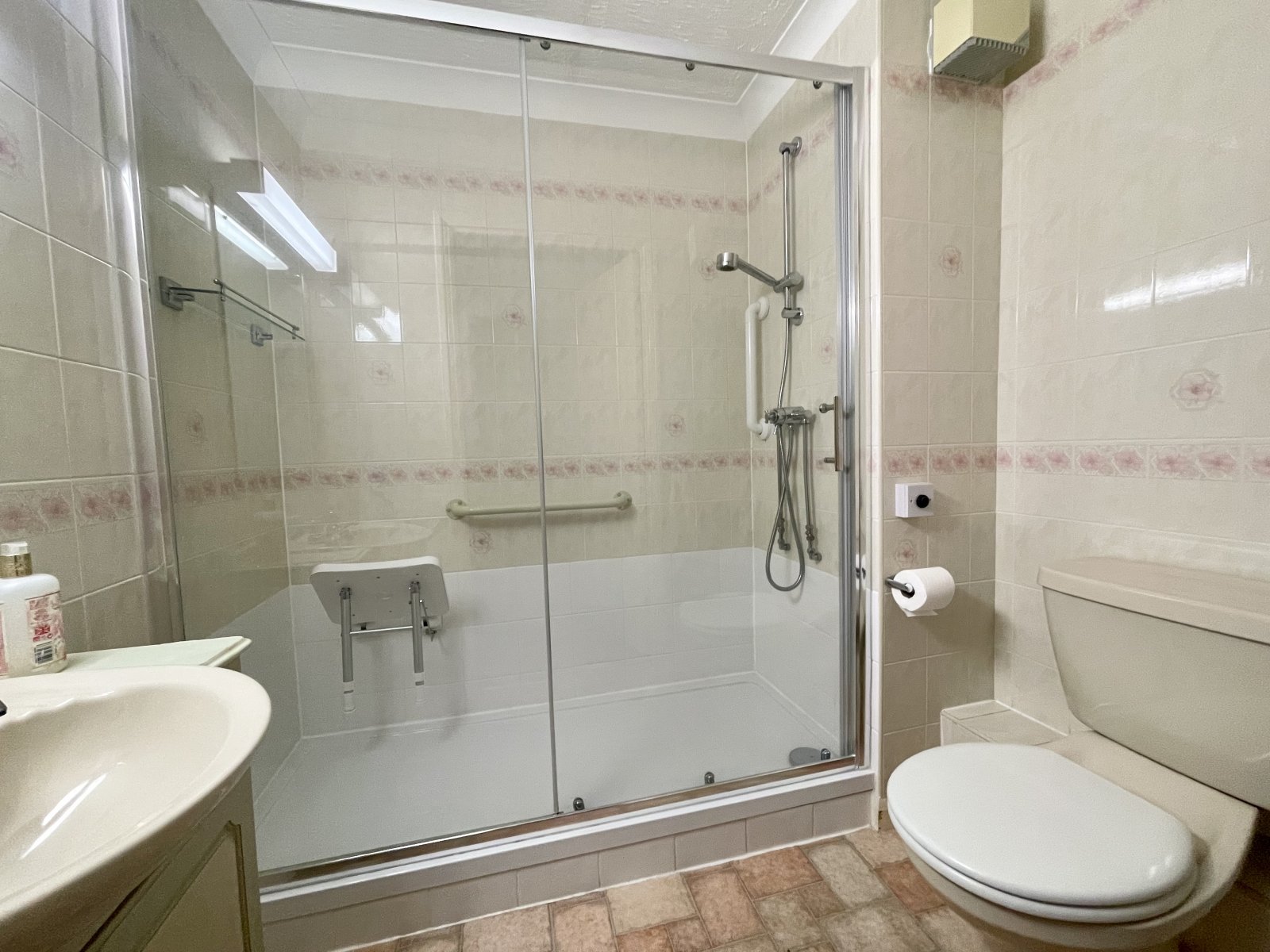 A three piece suite comprising low flush WC, countertop mounted wash hand basin with storage cupboard beneath. Larger than average shower cubicle with wall mounted mixer with adjustable showerhead, mobility seat, mobility grab rail and glass shower screen. Chrome heated towel rail. Wall mounted electric fan heater. Wall mounted extractor fan. Coved cornice to ceiling. Fully tiled walls. Tiled effect vinyl flooring. Vanity mirror with integrated LED lighting.