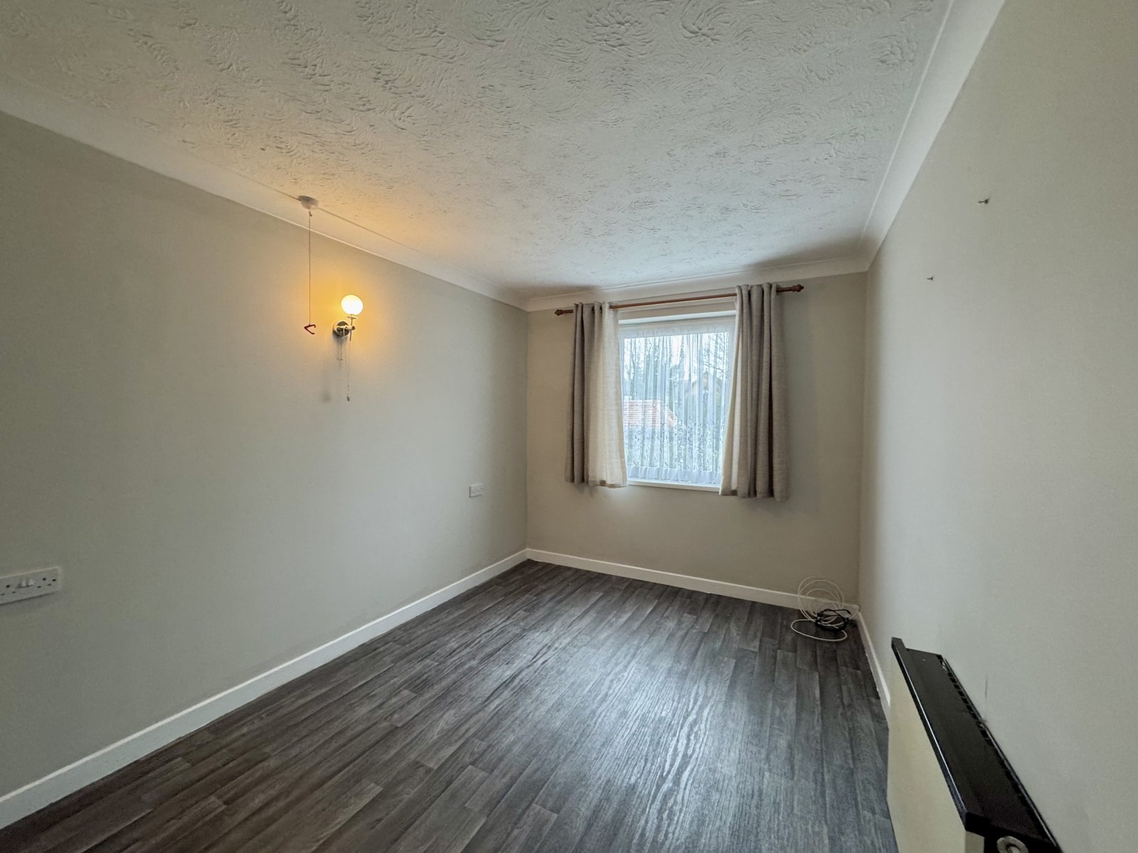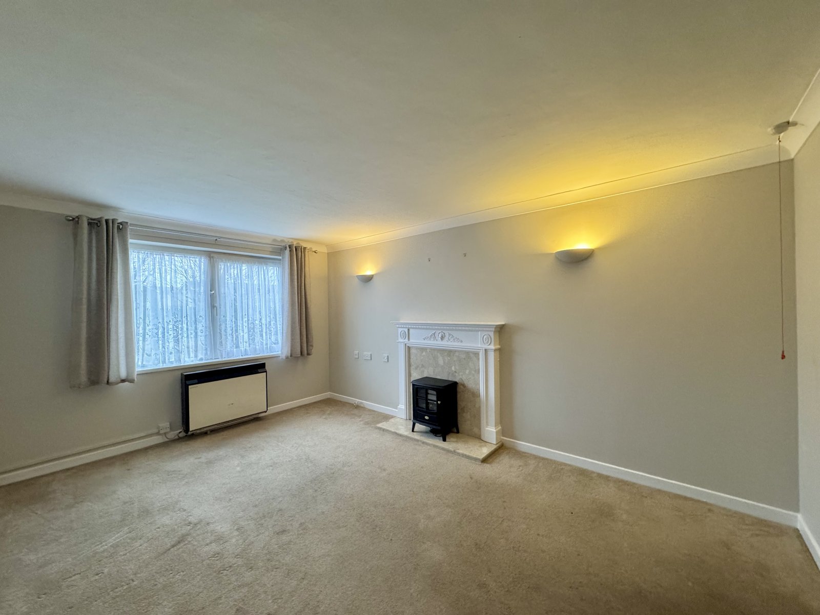 Large UPVC double glazed window to rear overlooking the communal garden. Feature mantle piece with electric coal effect burner. Wall mounted storage heater. Television aerial point. Telephone connection point. Wall mounted lighting. Emergency pull cord. Coved cornice to smooth plastered ceiling. Open archway leads to the;