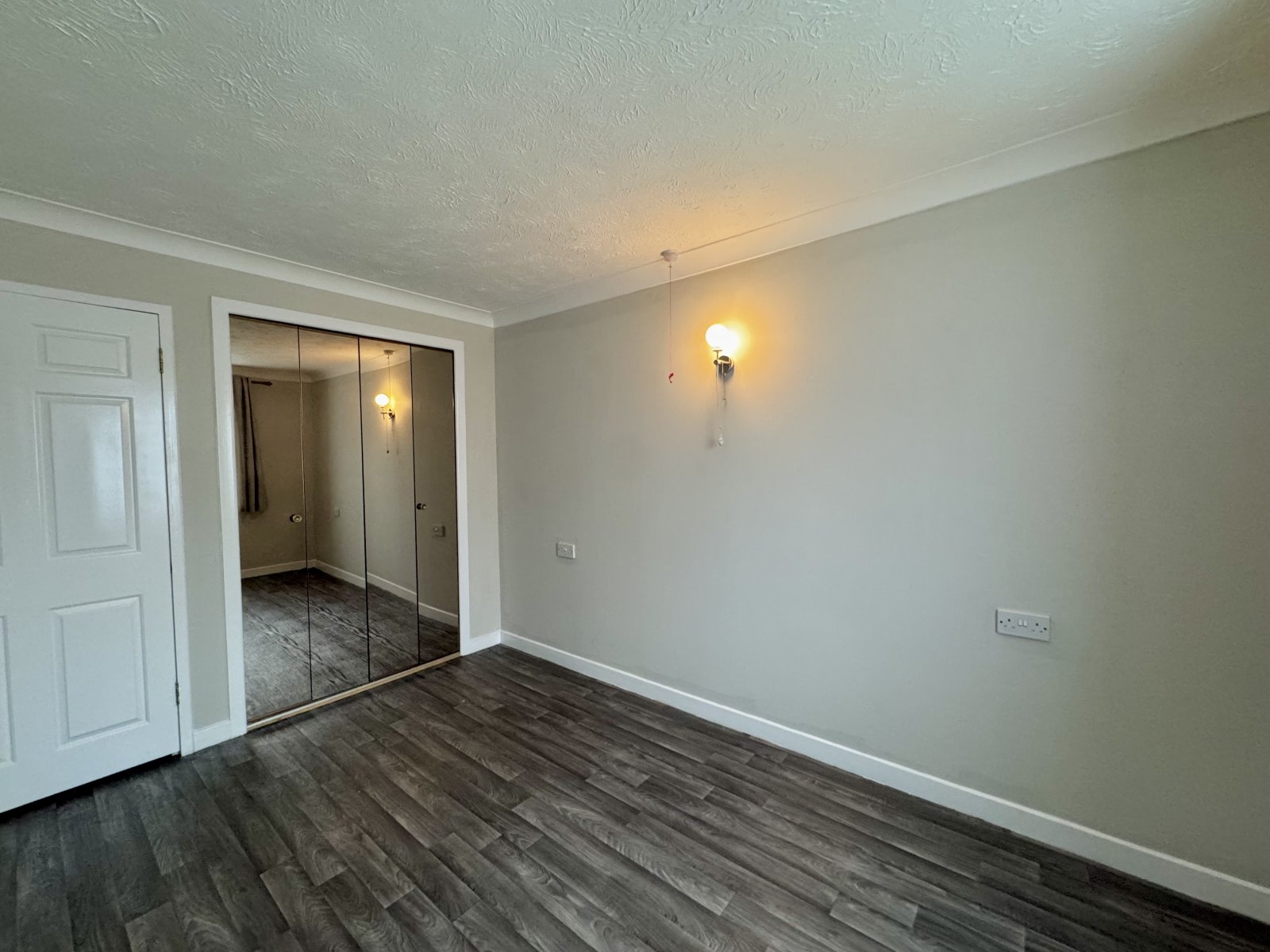 Plus fitted wardrobe units. UPVC double glazed window to rear overlooking communal rear garden. Wall mounted storage heater. Wall mounted lighting. Emergency pull cord. Telephone connection point. Mirror fronted bi-folding doors provide access to the fitted wardrobe unit.