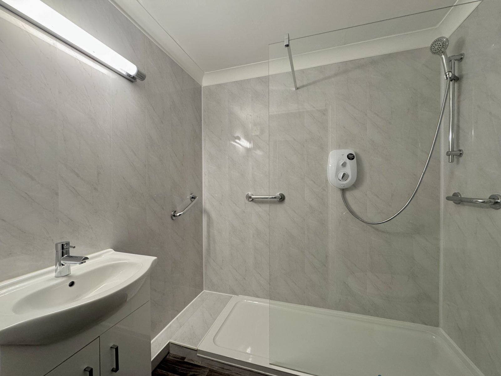 Fitted with a modern three piece suite comprising of low flush WC. Wash basin with vanity cupboard beneath. Easy access walk in shower cubicle with wall mounted electric shower. Vinyl flooring. Aqua panelled walls. Electric fan heater. Coved cornice to ceiling. Chrome heated towel rail. Electric shaver charging point. Extractor fan. Wall mounted lighting.