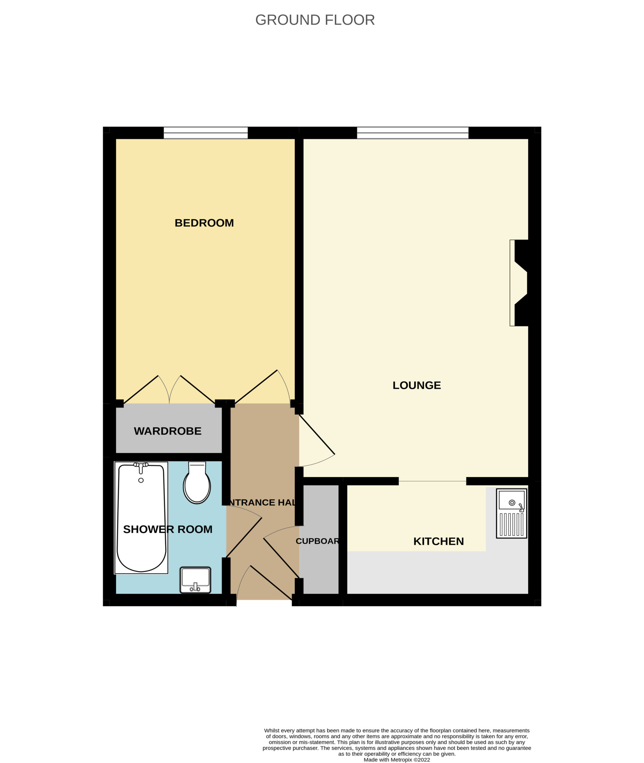 Plus fitted wardrobe units. UPVC double glazed window to rear overlooking communal rear garden. Wall mounted storage heater. Wall mounted lighting. Emergency pull cord. Telephone connection point. Mirror fronted bi-folding doors provide access to the fitted wardrobe unit.
