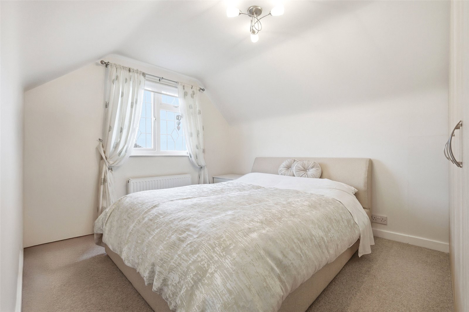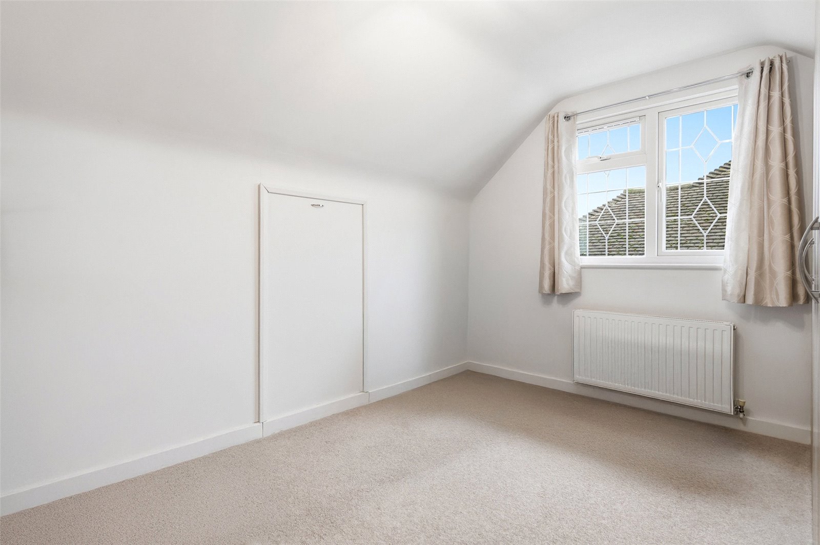 UPVC double glazed leaded light window to side. Wall mounted radiator. Range of fitted wardrobe units. Access to loft space via eves access door. High level skirting to smooth plastered ceiling.