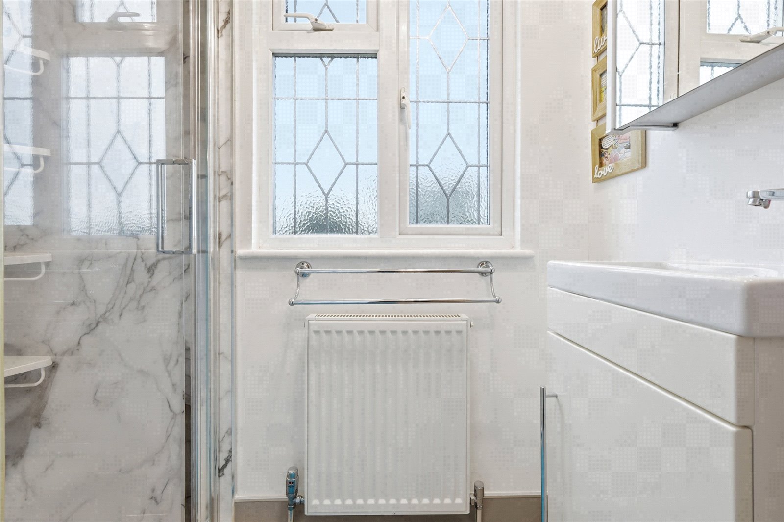 UPVC double obscured glazed leaded light window to rear. Fitted with a modern and contemporary two piece suite comprising wash basin with mixer tap and storage cupboard beneath and larger than average enclosed shower cubicle with wall mounted mixer, rainfall showerhead plus further adjustable showerhead. Glass shower screen. Marble effect Aqua panel walls. Tiled walls. Radiator. Smooth plastered ceiling Wall mounted extractor fan.