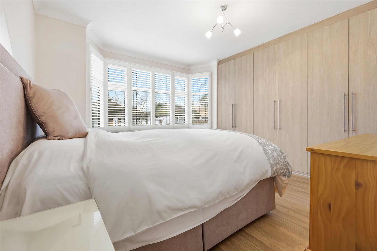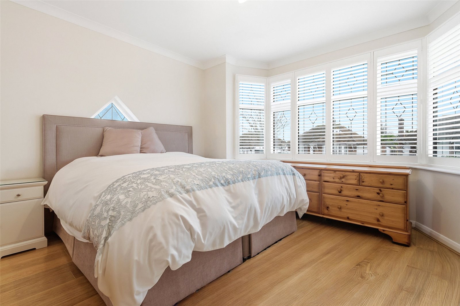 Large UPVC triple glazed leaded light bay window unit to front with fitted planation shutter. Further stained glass leaded light window to side. Wall mounted radiator. Extensive range of fitted wardrobe units. Wood effect laminate flooring. High level skirting. Coved cornice to smooth plastered ceiling.